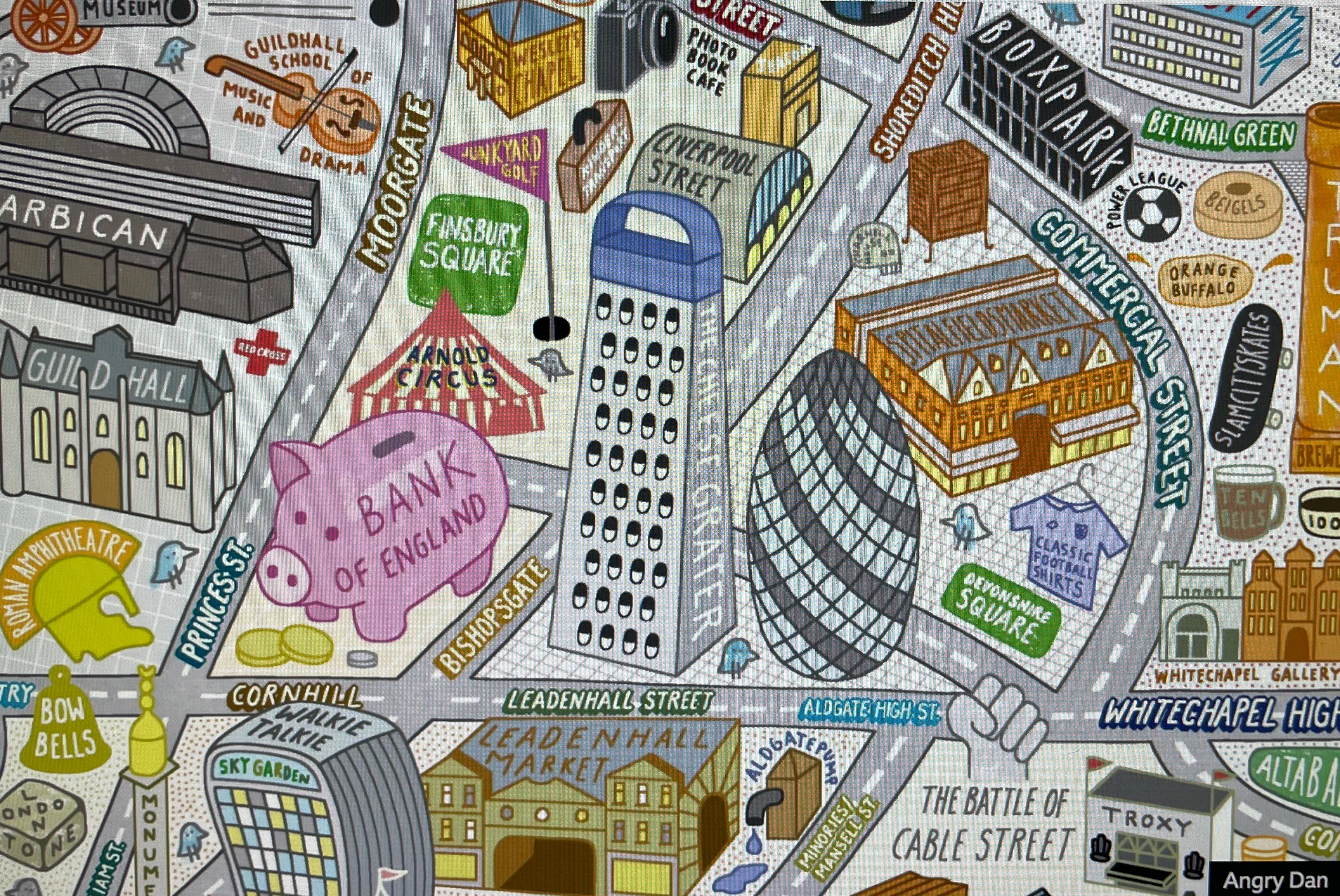 And Tim Stokes of BBC News, September 1, 2024, describes Angry Dan as “The street artist mapping London’s local icons.”