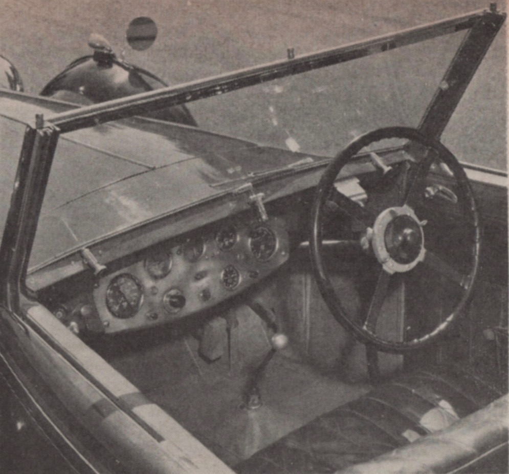 The Cabin. R&T identified, “Clustered around the horn button are the levers for spark advance, hand throttle, and headlight dipper. The throttle pedal is between the clutch and brake [perceived as beneficial for double-clutch downshifts in braking].
