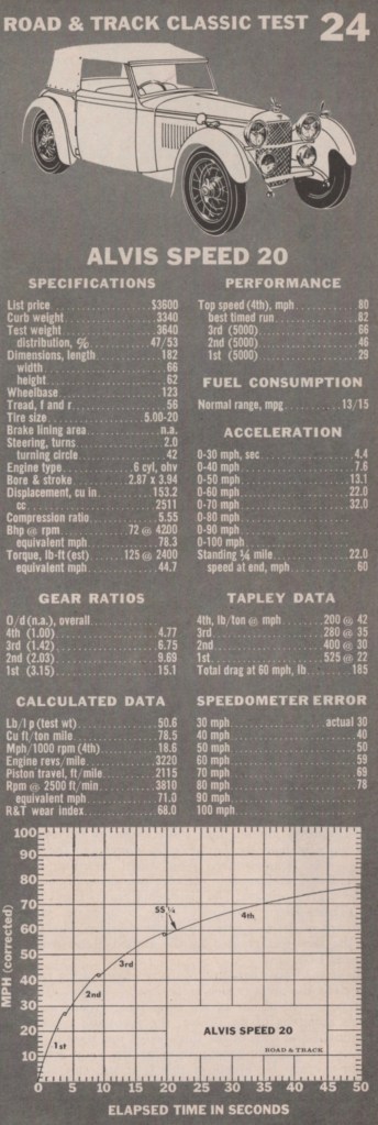 An Alvis/Chevy Analysis. “In our opinion,” R&T assessed, “the biggest drawback to this car is undoubtedly the smallness of its powerplant in relation to the machine’s overall size, weight and price. A piston displacement of just over 2.5 liters is well under the current Chevrolet’s 3.18 liters, for example, yet the Alvis is 700 pounds heavier. Nevertheless the Speed 20 has its share of surprises, not the least of which is its ability to outperform our lowest-price 6 by a substantial margin.”