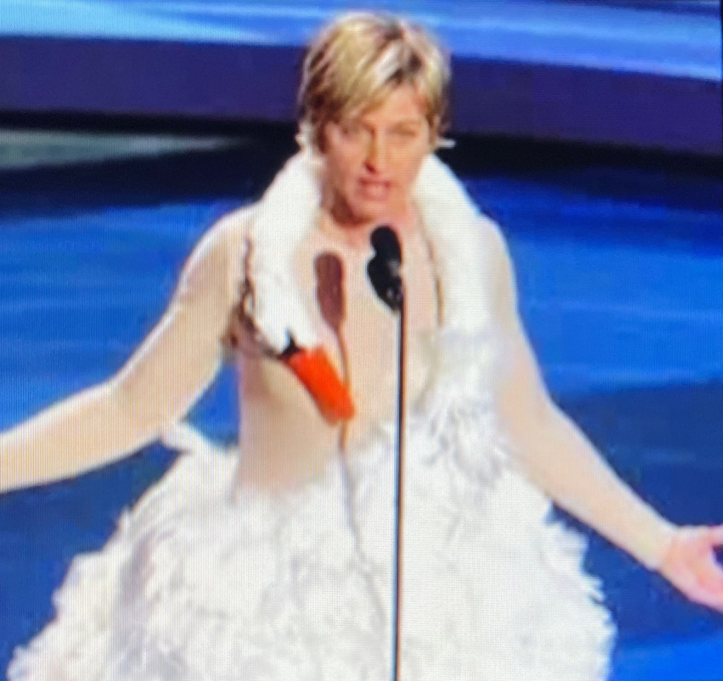 A swan of a different sort entirely. Ellen DeGeneris in her swan dress. Image from “The Name’s the Thing.”