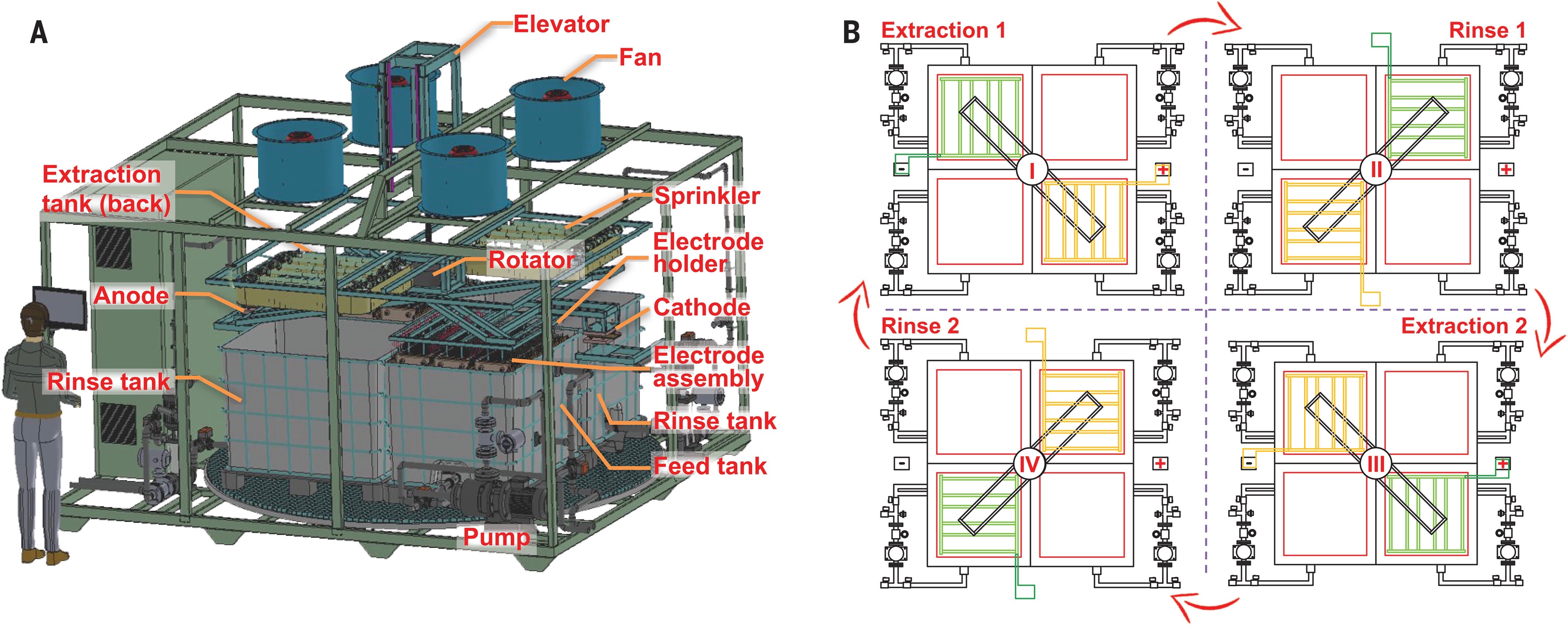 Li et al.’s DCMF Cell. An Editor’s summary recounts, “The oceans contain substantial aggregate quantities of lithium salts, but the comparatively low concentration makes them hard to separate from sodium and magnesium (see the Perspective by Darling). Li et al. now demonstrate a [Decoupled Membrane-Free, DCMF] method inspired by the batteries themselves …. In this method, iron phosphate electrodes can selectively intercalate lithium from salt water and then release it into fresh water. Charge balance is provided by silver oxidation and reduction at paired counterelectrodes in each medium, keeping all other cations on the salt side.”