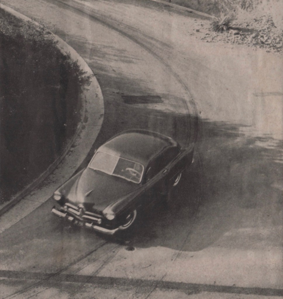 Handling. RandT recounted, “The Henry J, because of its short (100.0-in.) wheelbase, small turning circle, and actual finger-tip steering is a dream in traffic…. There is some roll, but this doesn’t seem to affect its cornering ability. The Henry J seems to ‘dig in’ just enough in corners to stick like a leech. With the tire pressures up, there seems to be no evidence of either under- or oversteer.”
