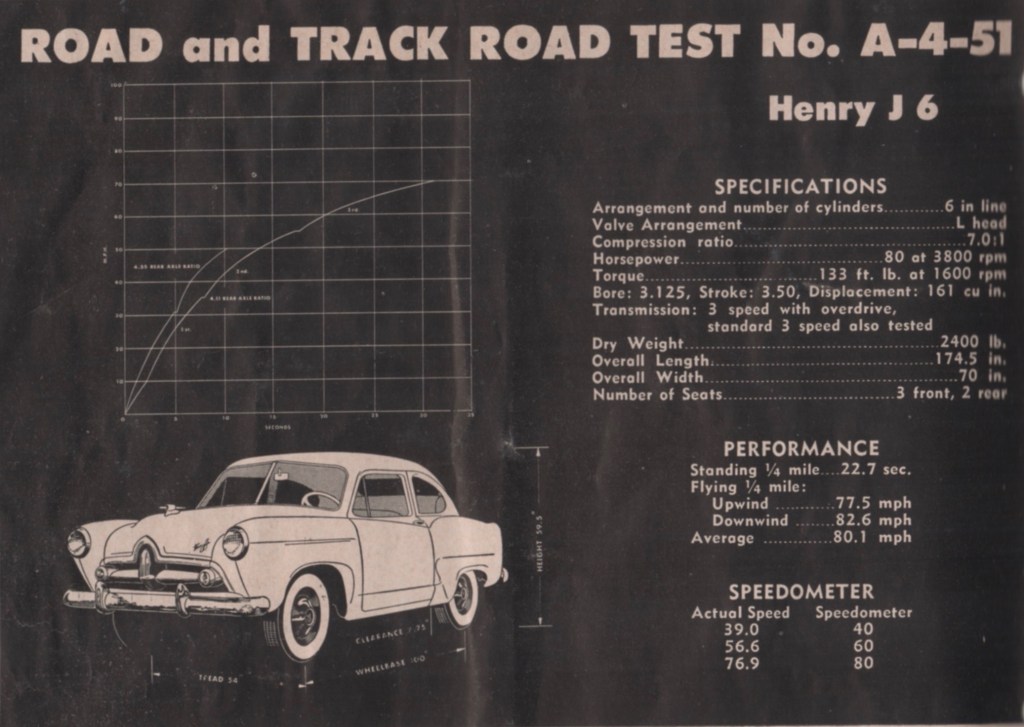 Blowing Off Detroit. “Thru the winding, hilly country,” the magazine said, “the Henry J lived up to all Road and Track has claimed for it. It blew off the best of Detroit had to offer without half trying. The acceleration figures in the chart, however, reflect the ‘too-high’ gearing.”