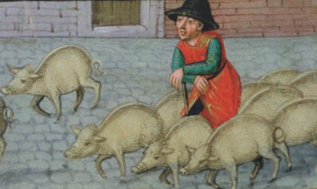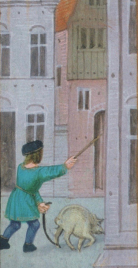 “Medieval pigs,” Jørgensen describes, “were literally kept on a leash. In medieval drawings, the swineherd leading a pig in an urban area holds a rope tied to a hindfoot of the pig so he can pull it back. The swineherd also carried a staff to steer the animal and nudge it forward.”