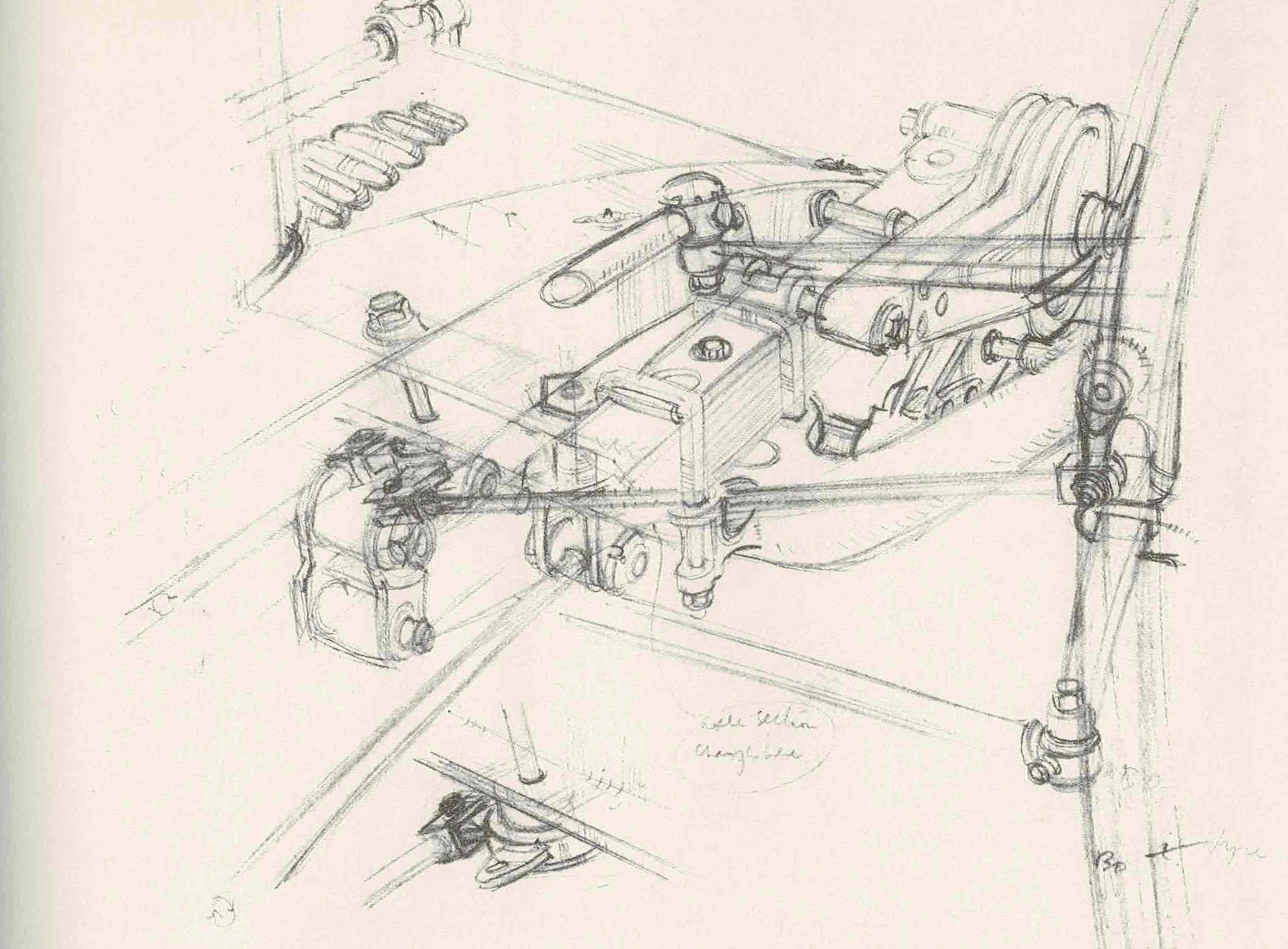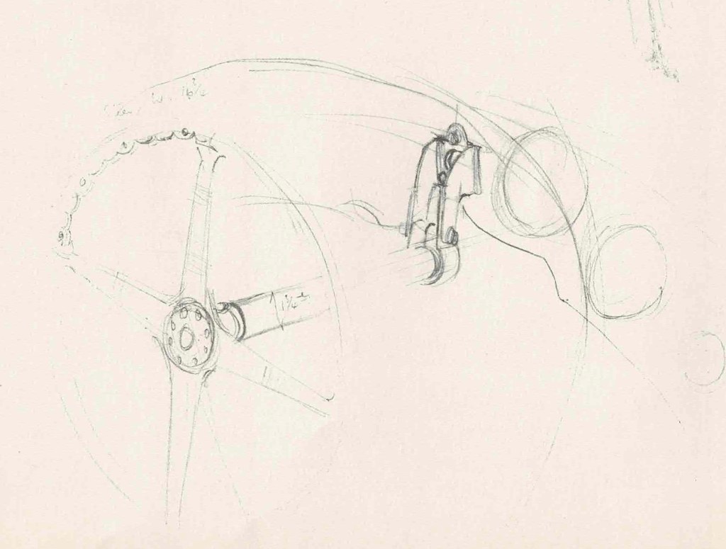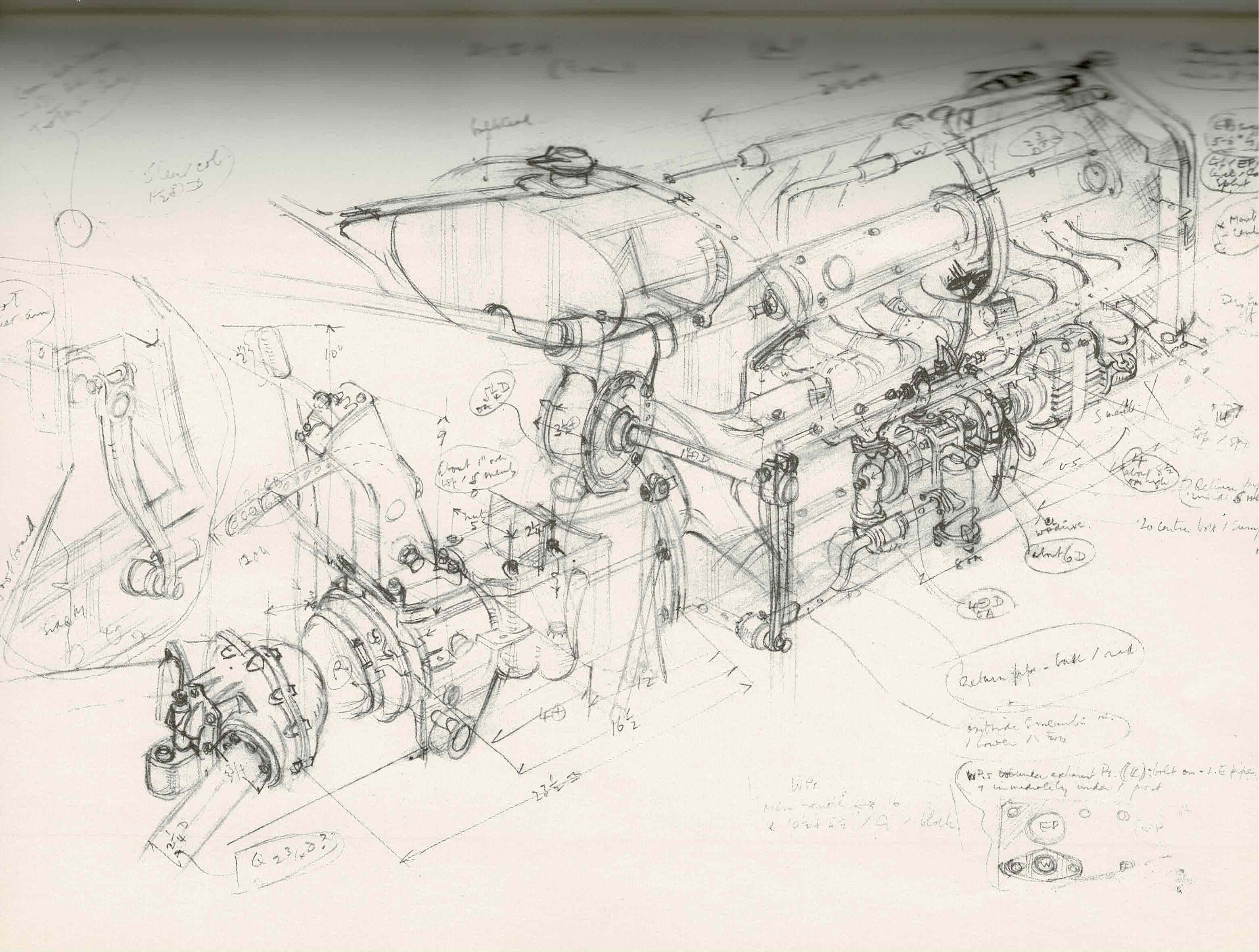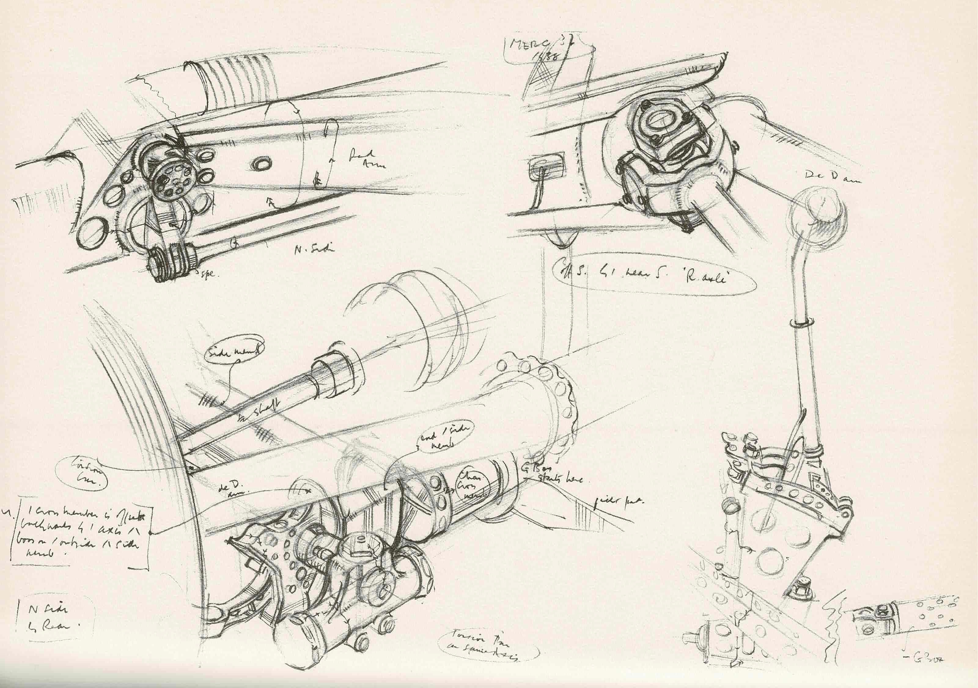 W.163 Rear Suspension Detail. Cresswell devoted a drawing to the W.163’s final drive, to which Pom observed that the De Dion rear end had an integrated back axle and gearbox.