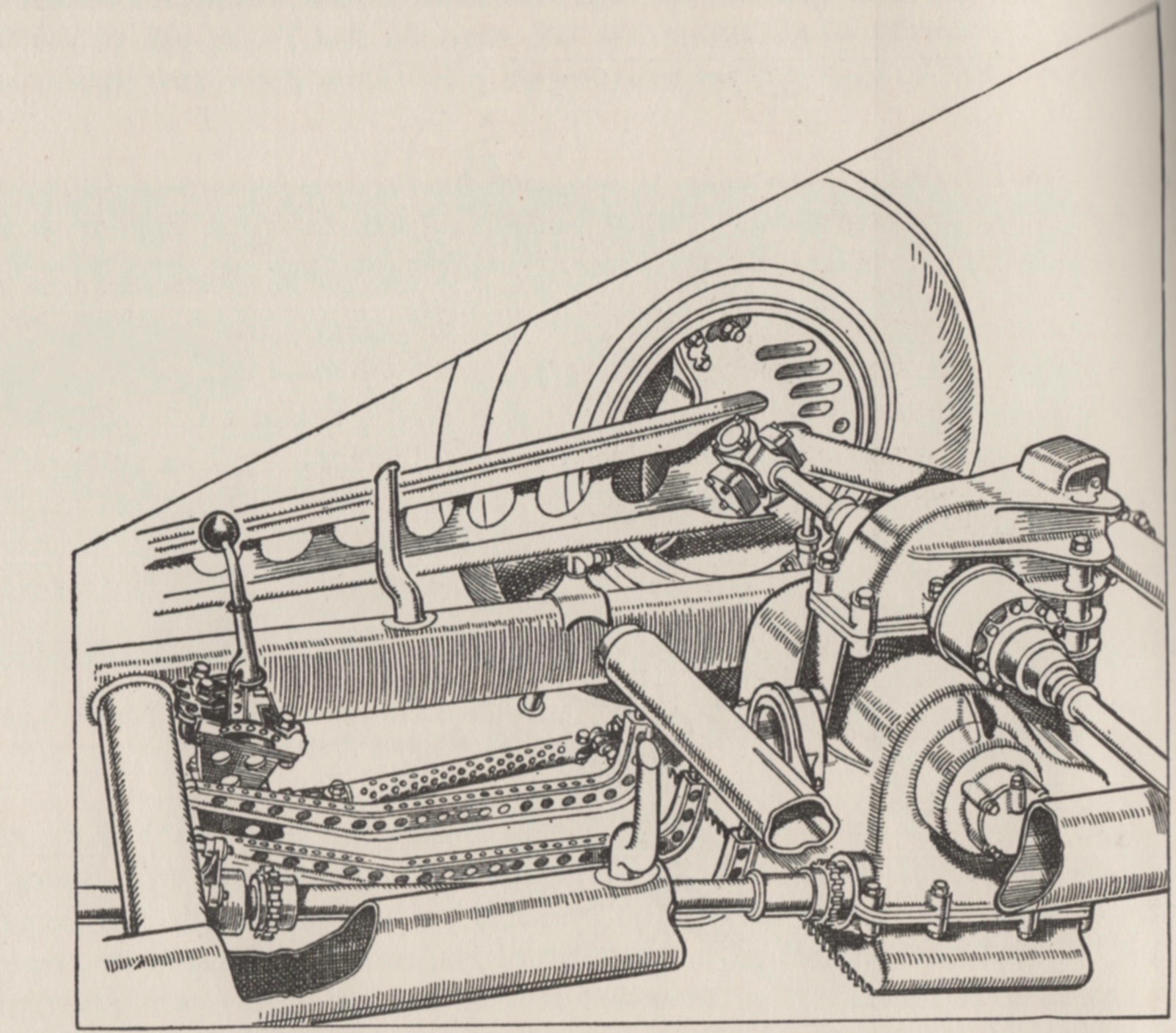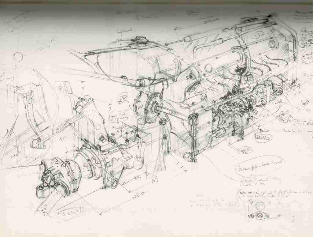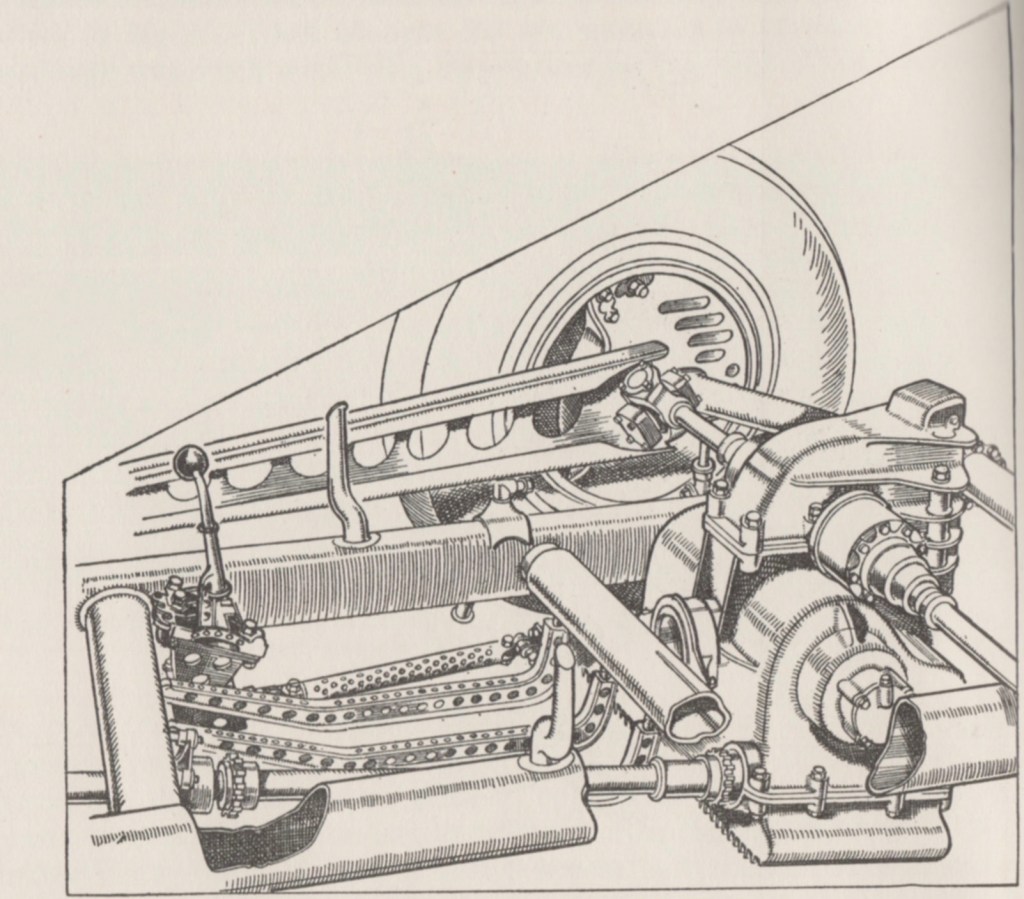 Pom continued, “A modified version of the 1931 transmission was used embodying two propeller shafts and two crown-wheels and pinions, the differential being mounted at the apex of the V and thus virtually sprung weight.”