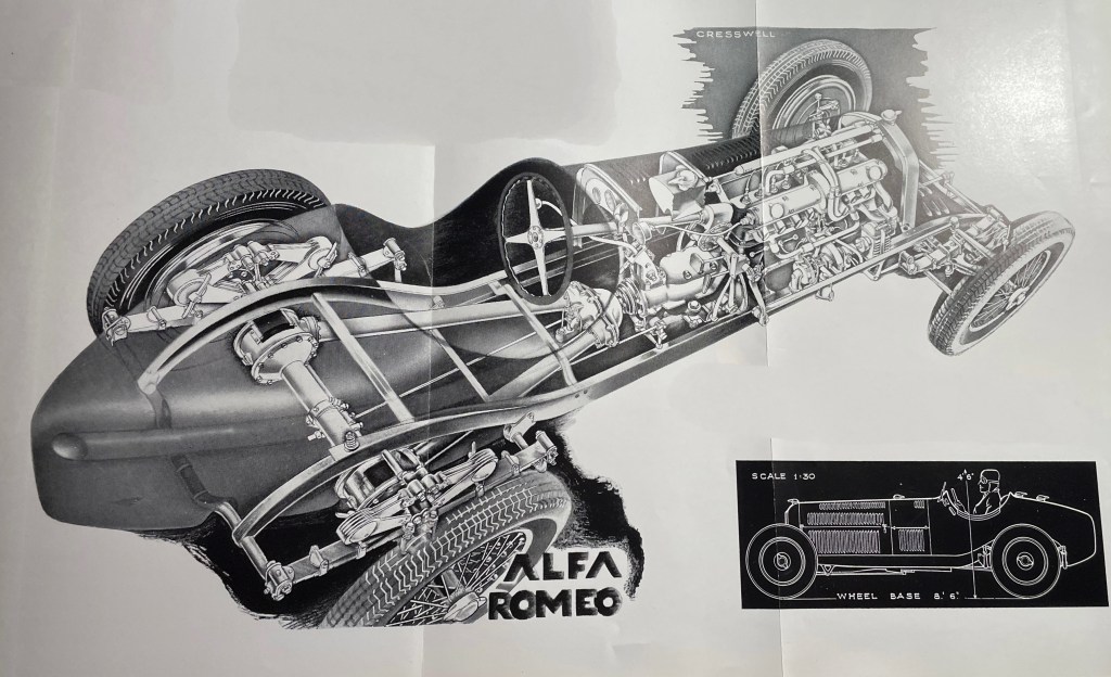 1932 Alfa Romeo Type P.3. Pom recounted, “In 1931 Sig. Jano designed a [bimotore] twin-engined car for Alfa Romeo, having two gearboxes and propeller shafts, with the driver and steering gear mounted on the centre-line of the car. In the following year he retained this principle for the P.3 model shown here, which had a single, eight-cylinder engine giving about 180 b.h.p.”