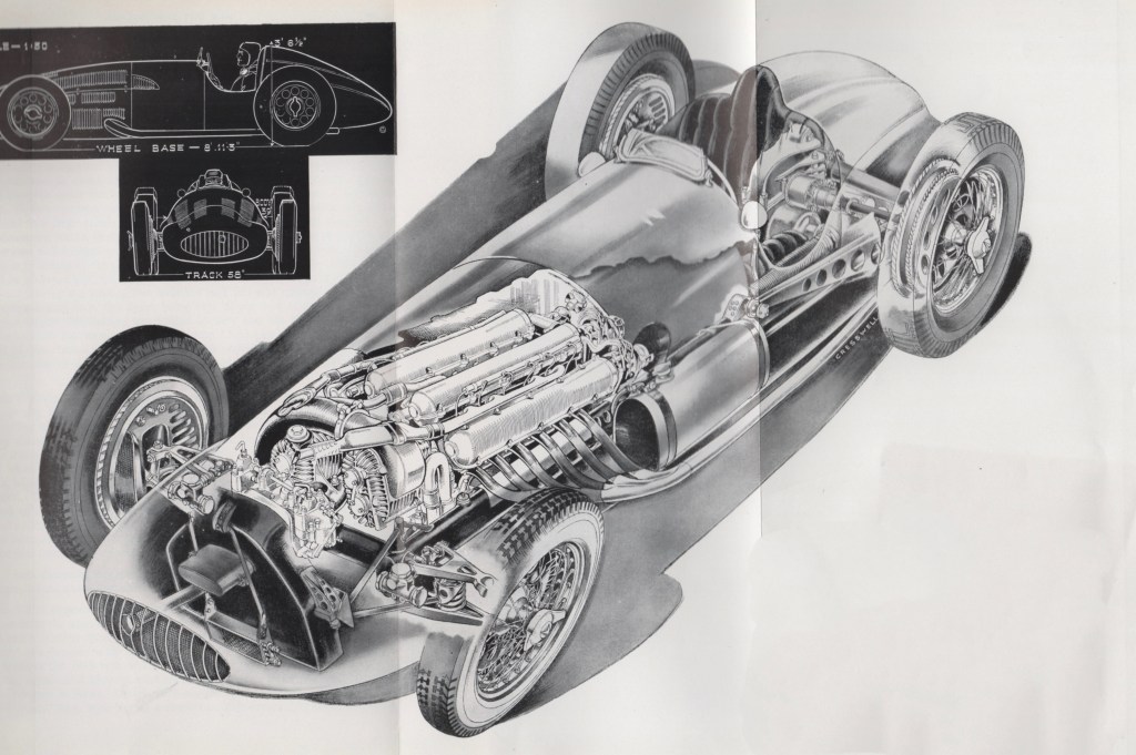 1939 Mercedes-Benz, Type W.163. The W.163 evolved from the firm’s W.154 which, Pom noted, “was a direct continuation of the 1937 Type 125, many of the parts being interchangeable. In 1939 improvements were made in detail and the Type W.163 won five out of seven races in the last season before the outbreak of World War II.”