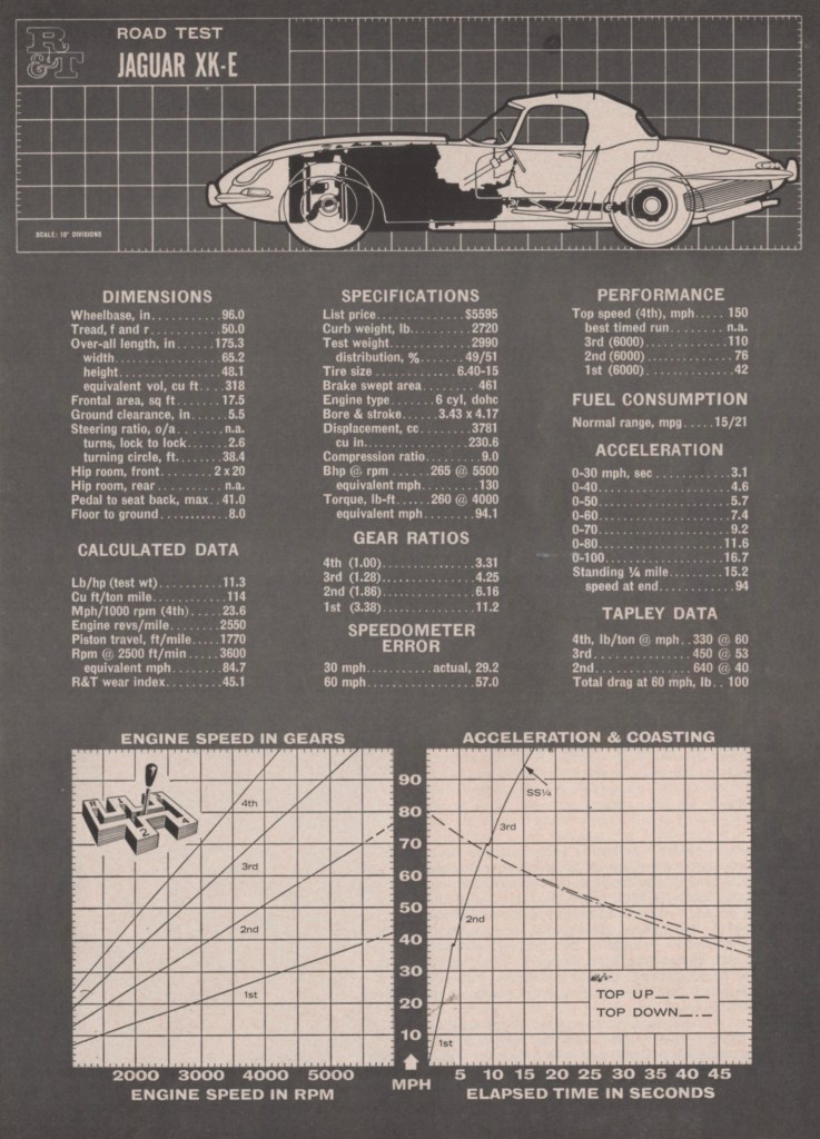 Conclusion. “As is well known,” R&T wrote, “the genuine top speed of a showroom-stock Jaguar XK-E is 150 mph.” Unless your crumpet is a statuesque 6-footer, I’d recommend the Jag. ds