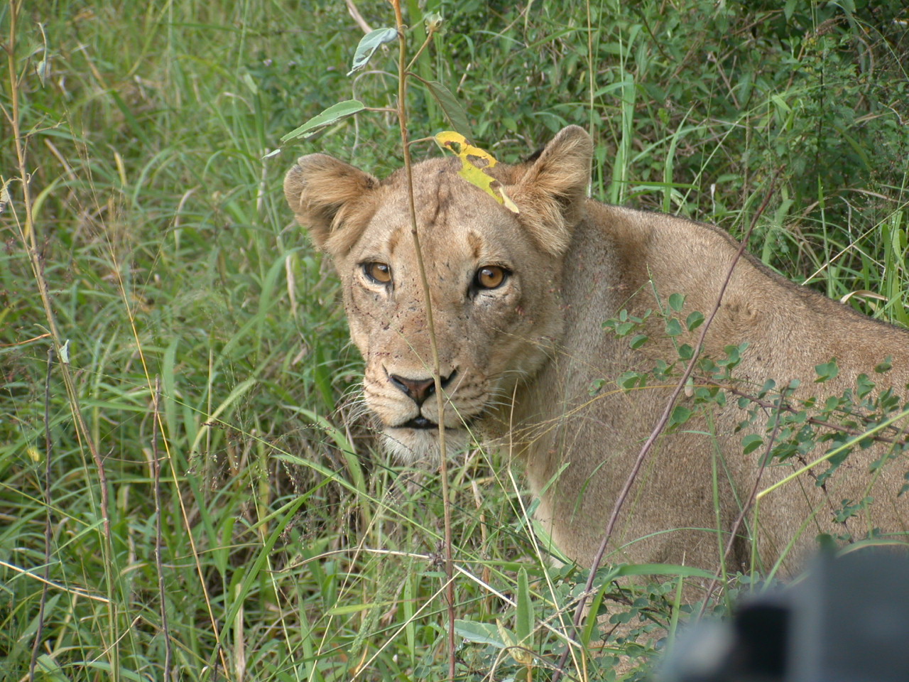 My favorite photo from the visit. The tip of our Range Rover establishes proximity to this lioness.