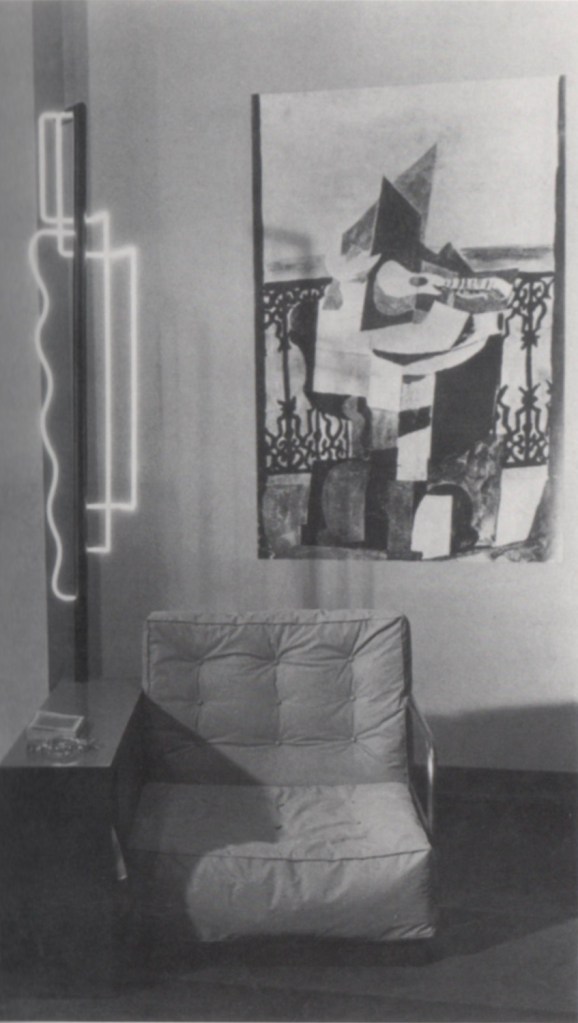 Nelson and Le Corbusier. “Nelson’s stylistic experiments during his nine months of work on What a Widow! were largely guided by Le Corbusier’s ‘five points of architecture [pillars, roof garden, open floor plan, long windows, and open facades]…. “In Nelson’s own design,” Albrecht observes, “Le Corbusier’s influence is especially noticeable in the open living space of Tam’s Parisian villa, which is shaped by freestanding curvilinear walls and further defined by groupings of metal tubular furniture.”