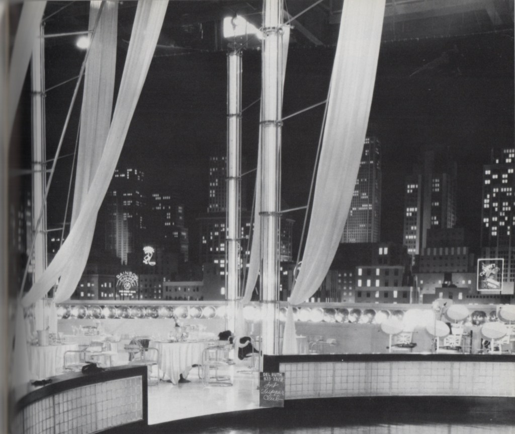 Albrecht gives an example: “… the nightclub designed for MGM’s Broadway Melody of 1936 is a space conceived with light as its main component. Light emanates from iridescent globes, passes through curving walls of glass bricks, and is reflected off gleaming metallic furniture. Tall columns of backlit cloth pass through chrome rings from which cantilevered arms support billowing sails.”