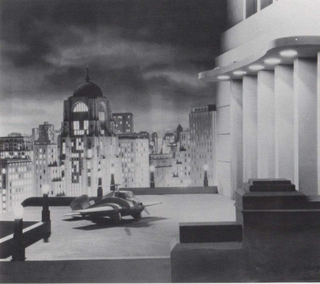 Transatlantic Tunnel. Originally titled simply The Tunnel, this one got renamed for us Yanks. Albrecht recounts, “Ernö Metzner’s designs for The Tunnel, 1935, a pro-technology British science fiction film most noted for its streamlined New York-to-London tunnel, its trains, and its automobiles, include an airborne device that closely approximated Eugène Hénard’s formula for the type of airplane suited for urban travel: ‘a light aeroplane, equipped with horizontal helices in addition to a vertical propeller, and capable of remaining stationary in the air, hovering over a given point.’ ”