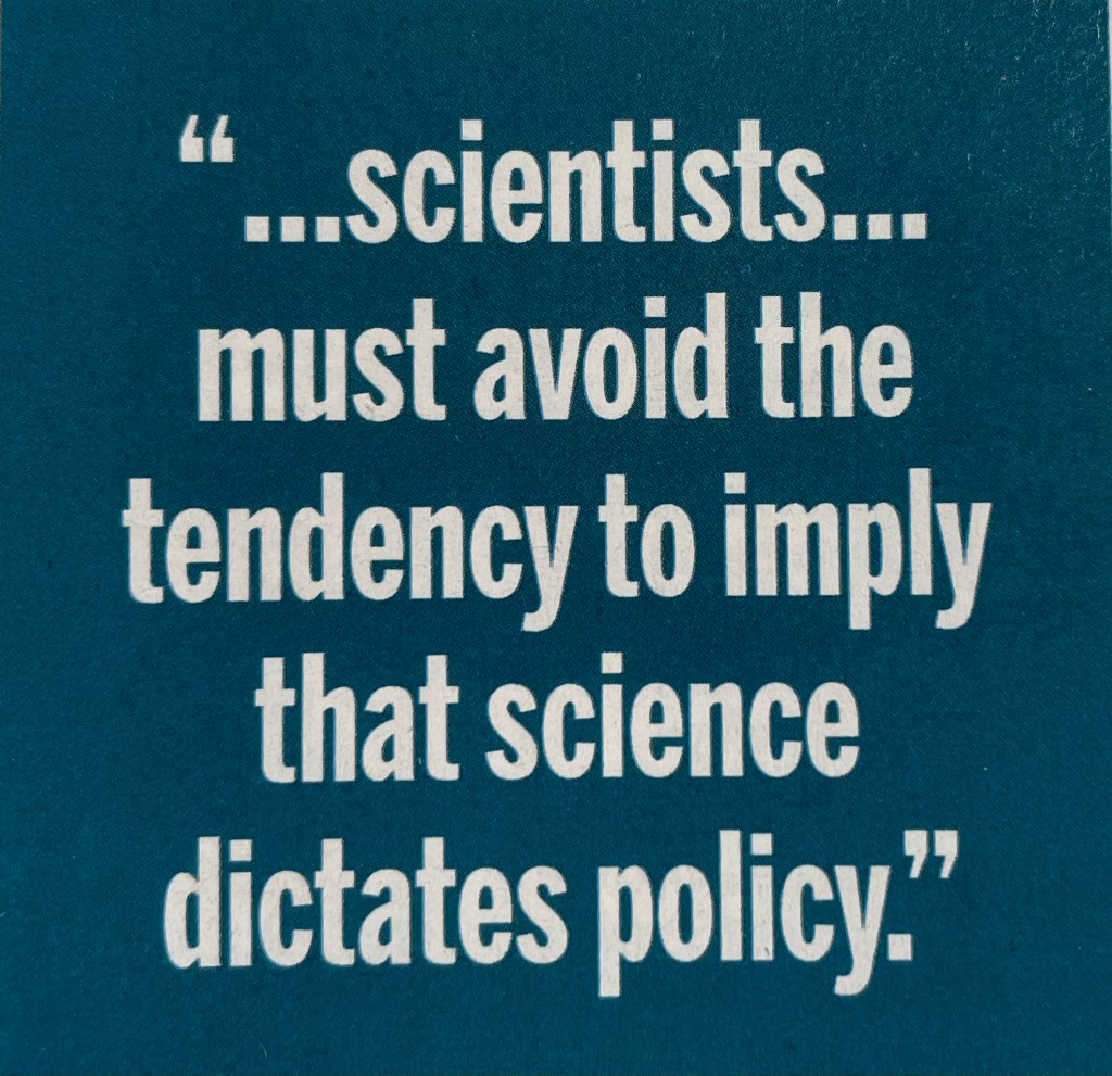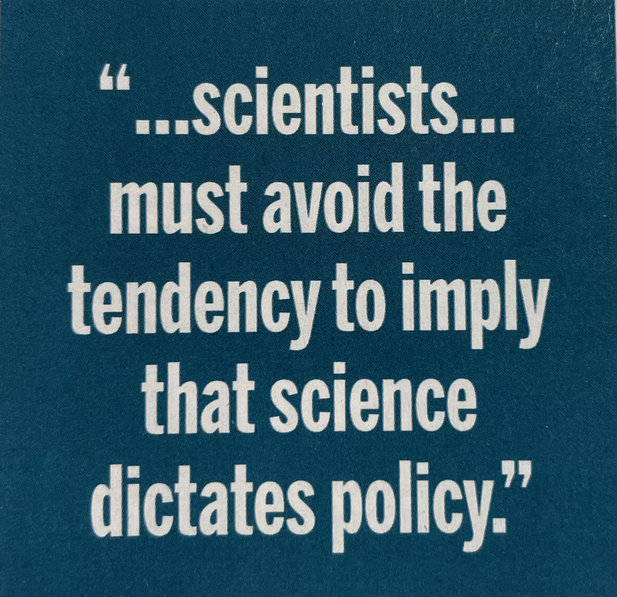 She continues, “It is up to elected officials to determine policy based on the outcomes desired by their constituents. It is the role of science to inform these decision-makers as to whether those desired outcomes are likely to result from the policies being enacted.”