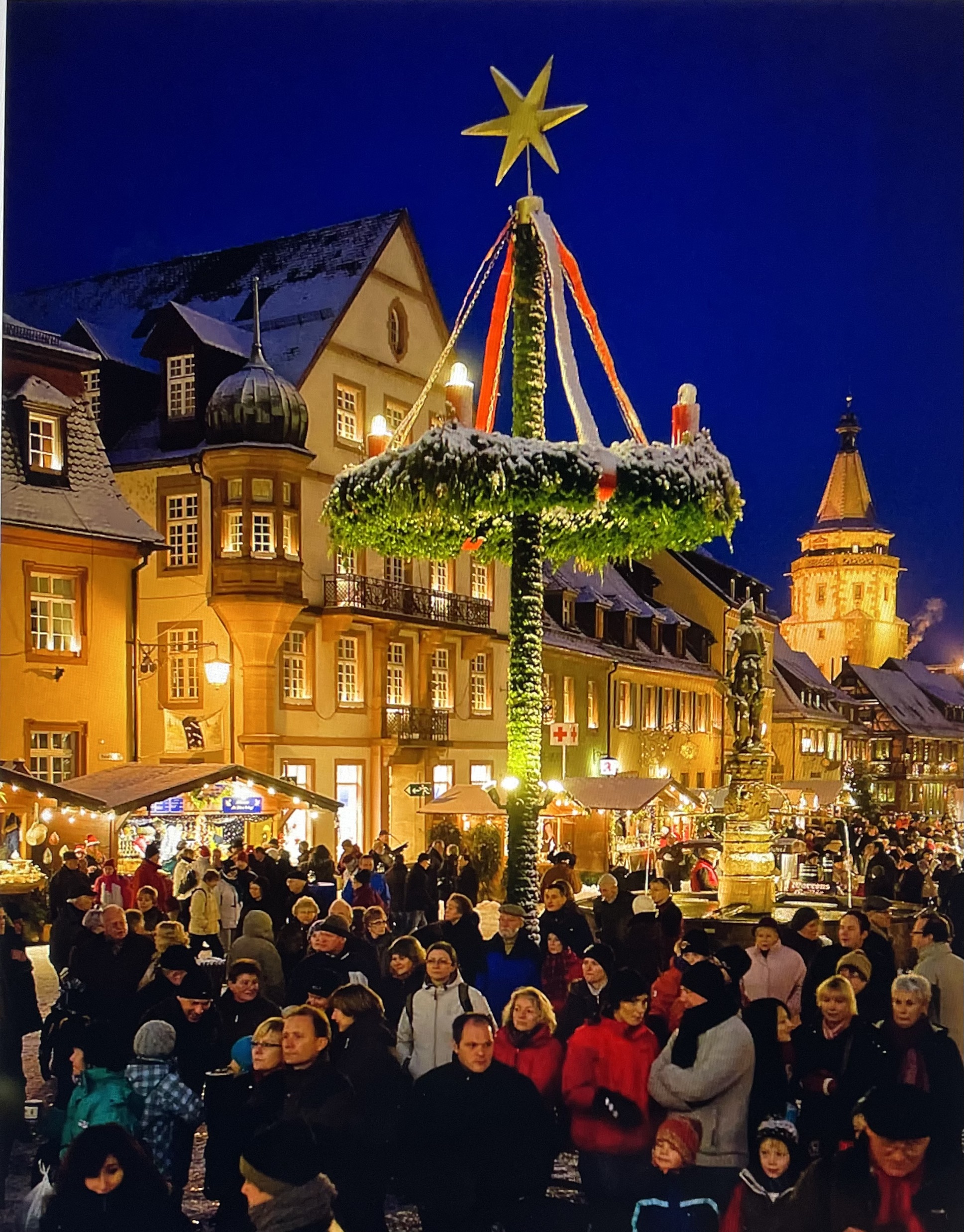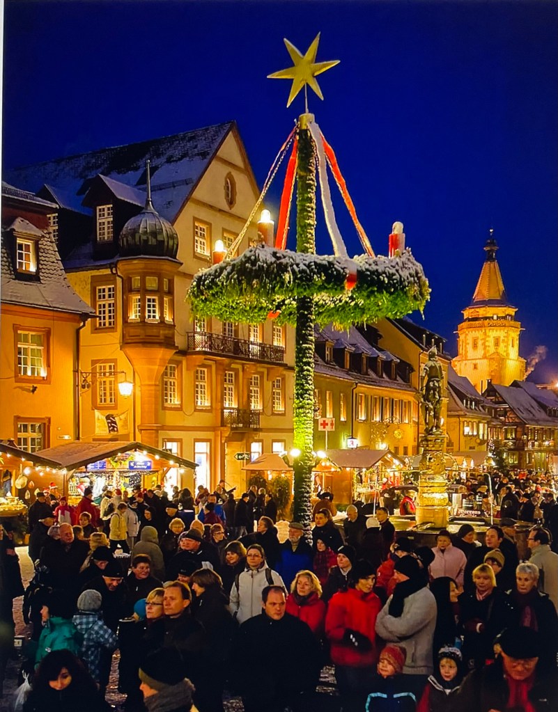 Weihnachten Celebrations. This is only one feature of the hamlet’s Christmas celebration: A traditional Weihnachtsmarkt is another as well as a special art display. NPR reports, “The art rotates each year. In the past the town has displayed reproductions of paintings by Marc Chagall and Andy Warhol. This year, Gengenbach is featuring the work of German illustrator Olaf Hajek.“