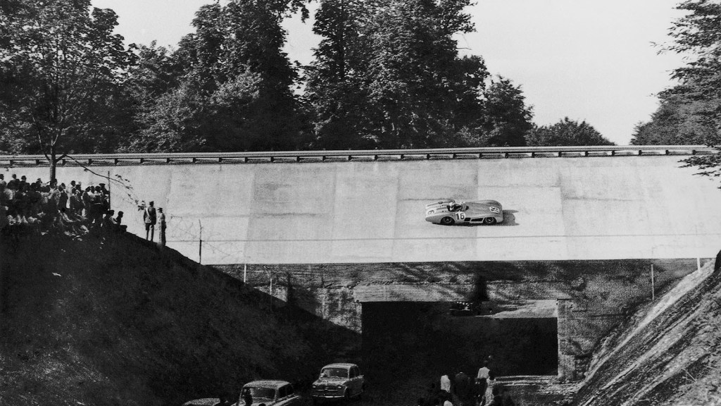 At the 1955 British Grand Prix, for example, C&SC recounts, “Mercedes achieved a 1-2-3-4, Moss winning from Fangio, kKling, and Piero Taruffi,” all four in open-wheel W196s. Wikipedia notes, “Several people, including Moss, believed that the Argentine allowed his British protégé to claim his debut win in front of his home crowd. This was, however, at Moss’ inquiry, consistently denied by Fangio, who claimed that Moss ‘was simply faster that day.’ ”