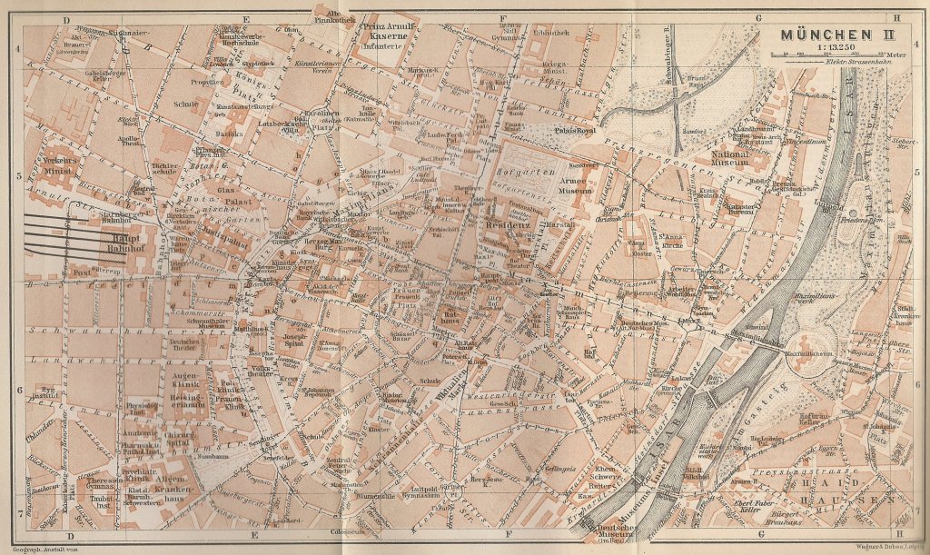 A Handy Guidebook. On my relatively frequent trips (BMW and Audi are both headquartered there), I brought along my Baedeker’s Southern Germany, 1910. As these happy snaps show, its Munich city map is still a useful one.