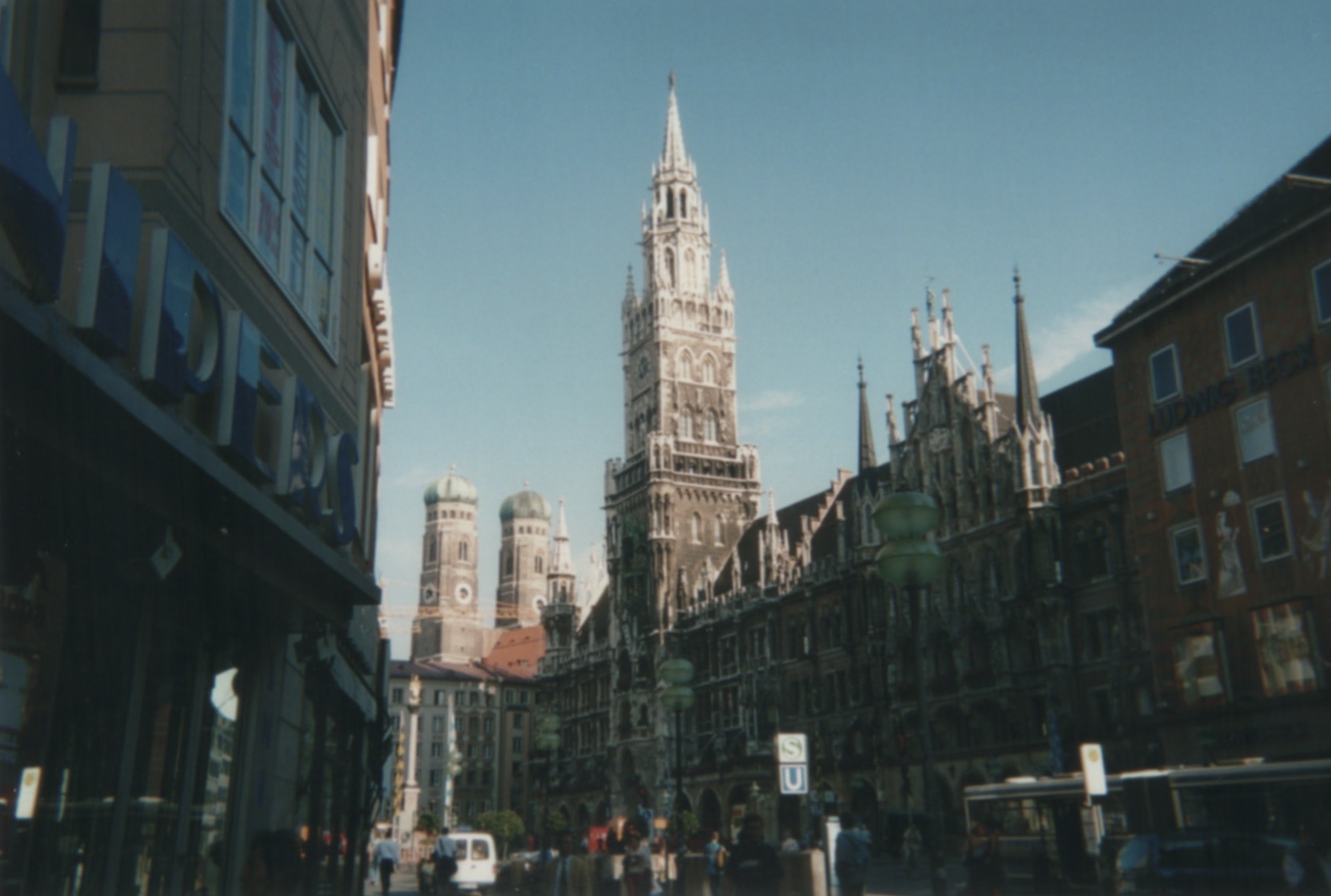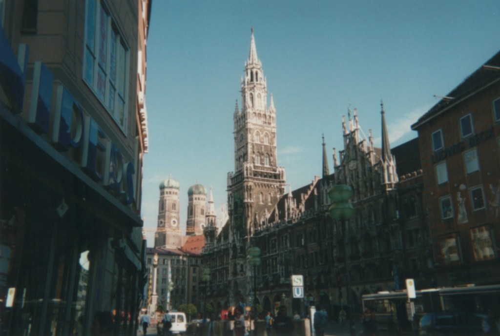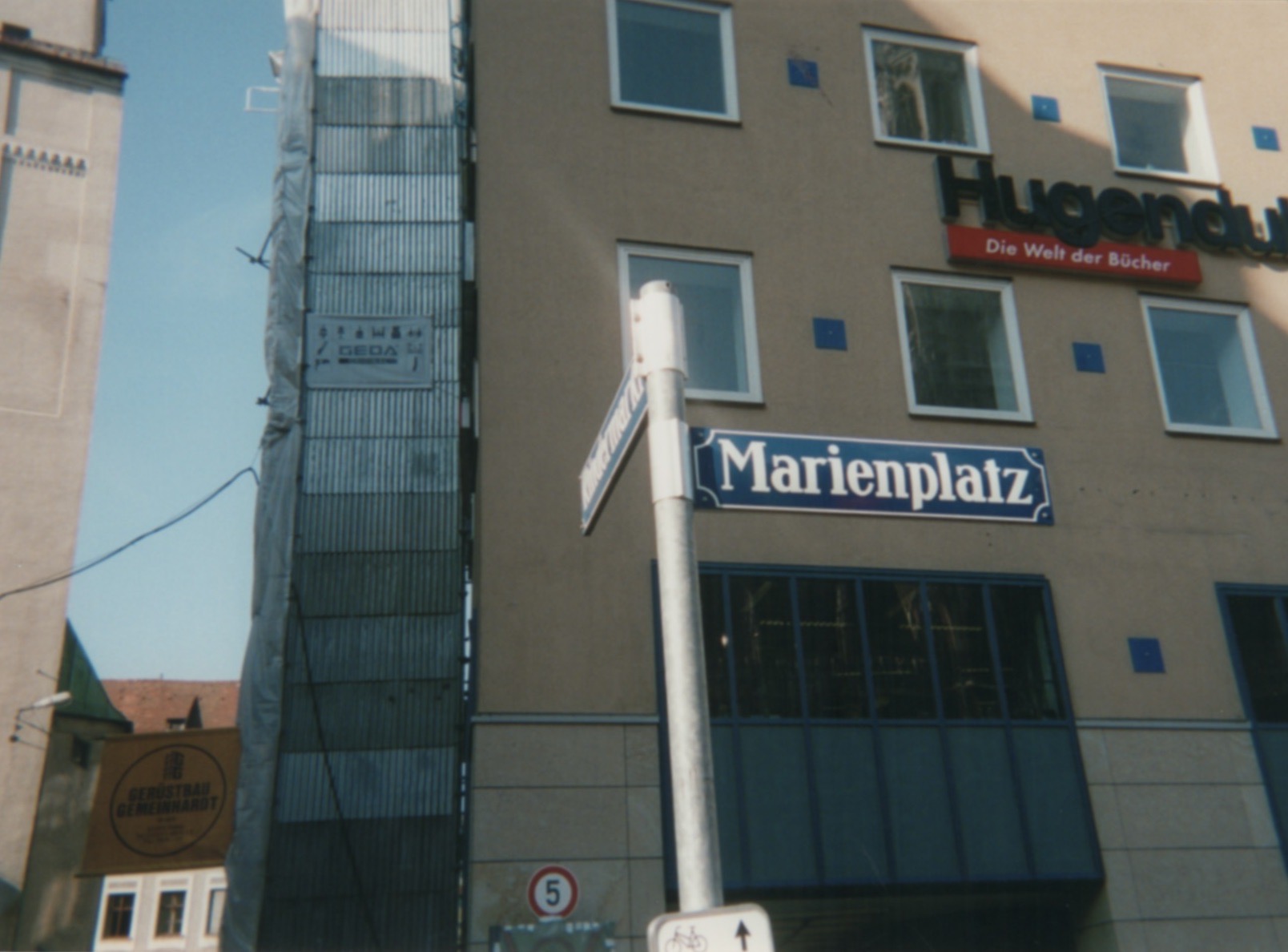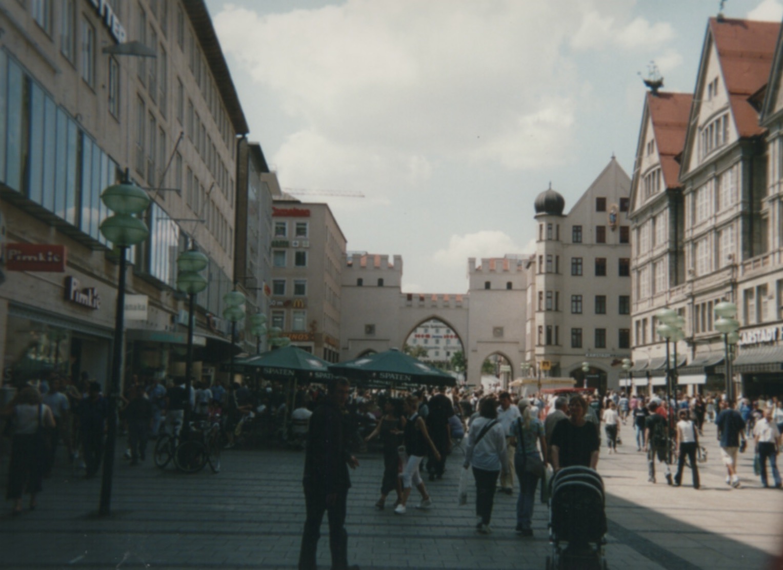 Kaufingerstrasse, “Buyers’ Street.” The pedestrian mall stretches west of Marienplatz to Karlsplatz. I’ve been a buyer several times, including a department store with a marvelous collection of music CDs and an optometrist where I found my first pair of round-rim glasses.