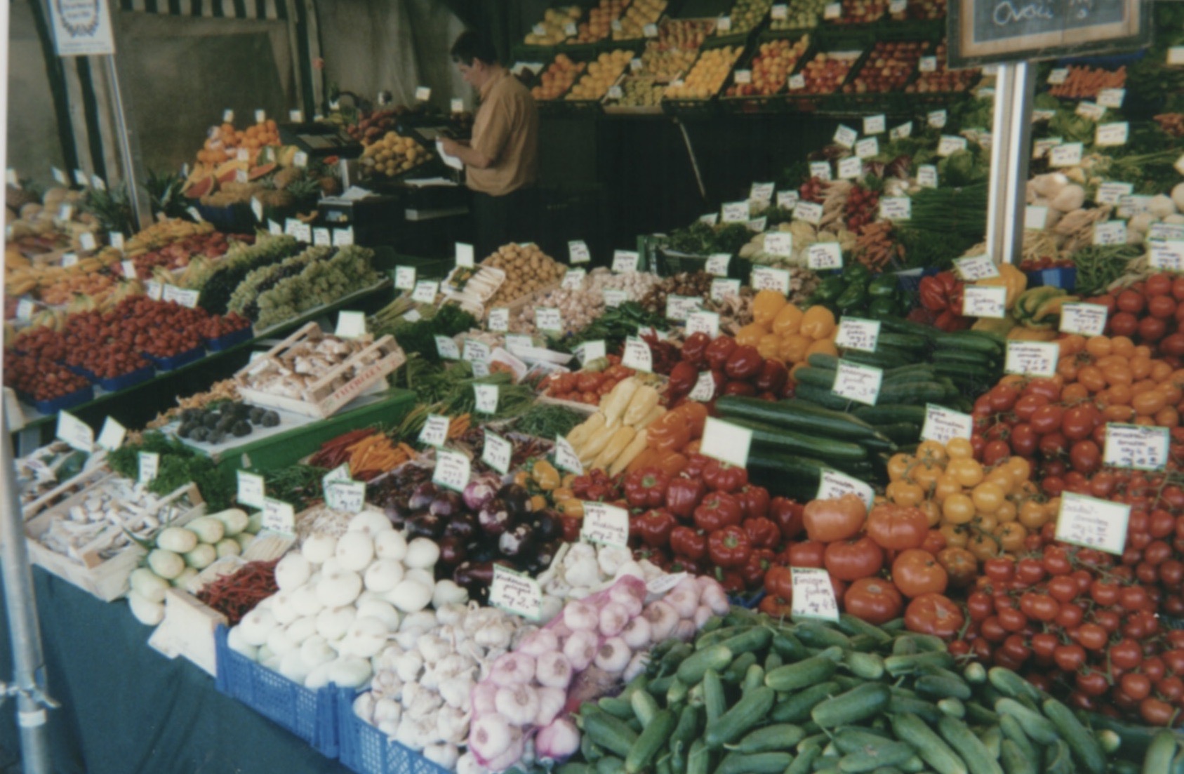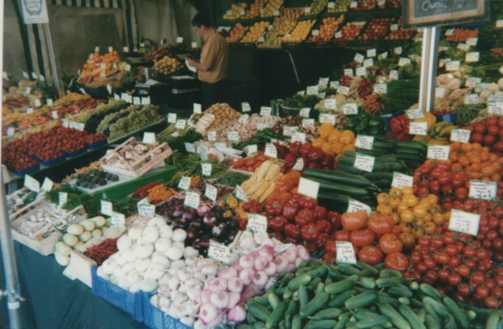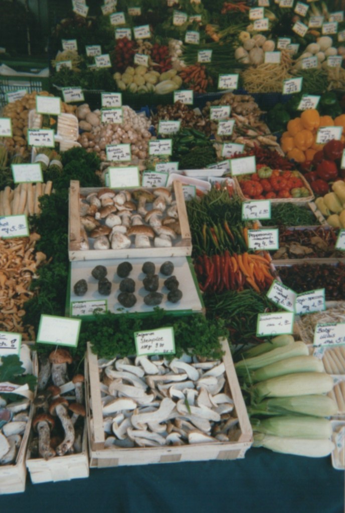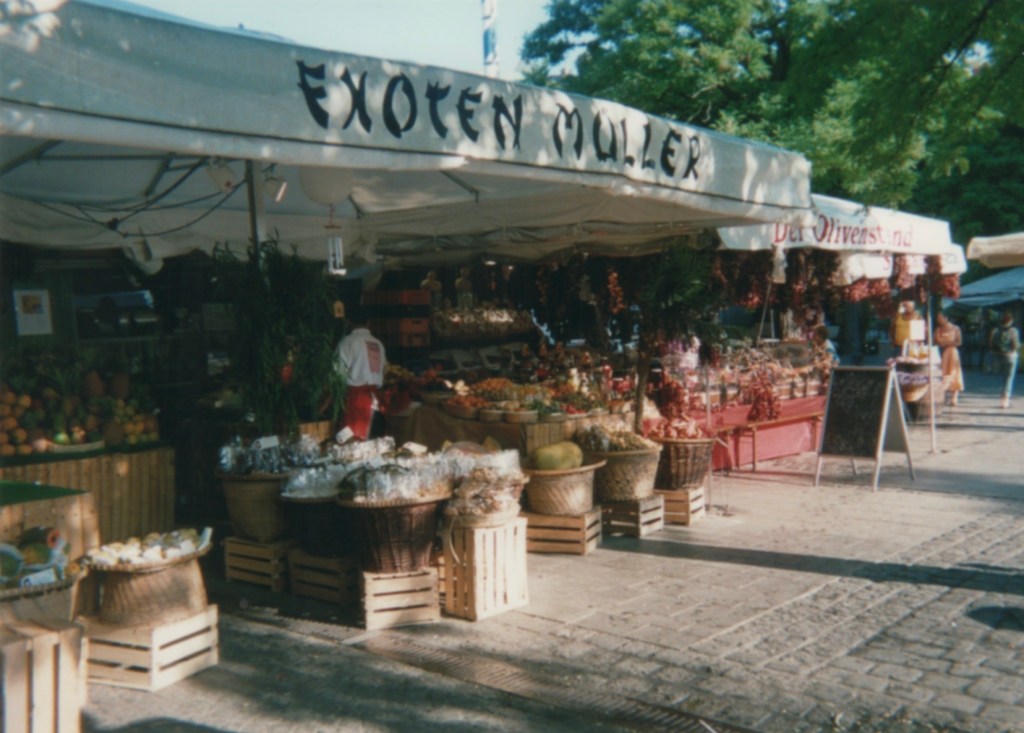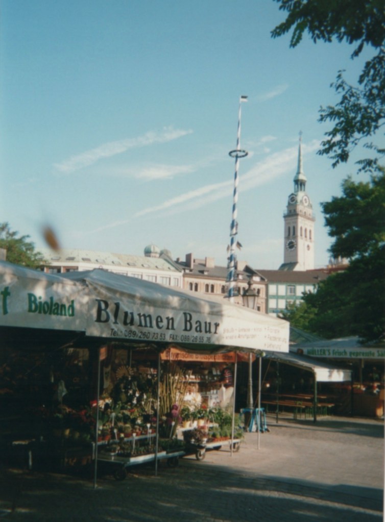 AS NOTED YESTERDAY, THIS STARTED serendipitously with Munich happy snaps from 2002. We continue our trippin’ today in that Bavarian city’s ViktualienMarkt just south of Marienplatz and conclude in a corner of my dining room.