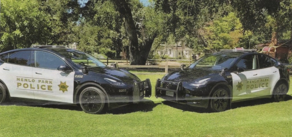 Buckley recounts that Menlo Park Tesla Model Ys are cited as “ ‘nearly unsuitable’ squad cars because the seats can’t accommodate their [officers’] duty belts and bulletproof vests, according to a recent report to the city council.”