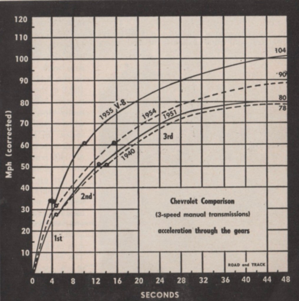 “A 1954 Chevrolet with manual shift gave markedly better performance than earlier models, as shown by the comparison chart below,” the R&T caption read.