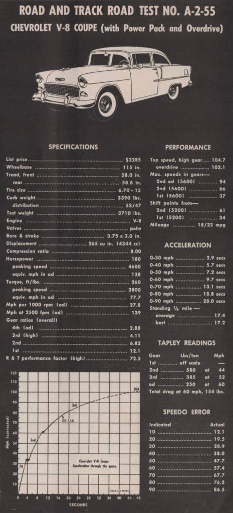 Here, 70 years later, are tidbits gleaned from R&T’s February 1955 road test of this car, together with “15 Years of Progress,” subtitled “a comprehensive report on Chevrolet performance” in that same issue.