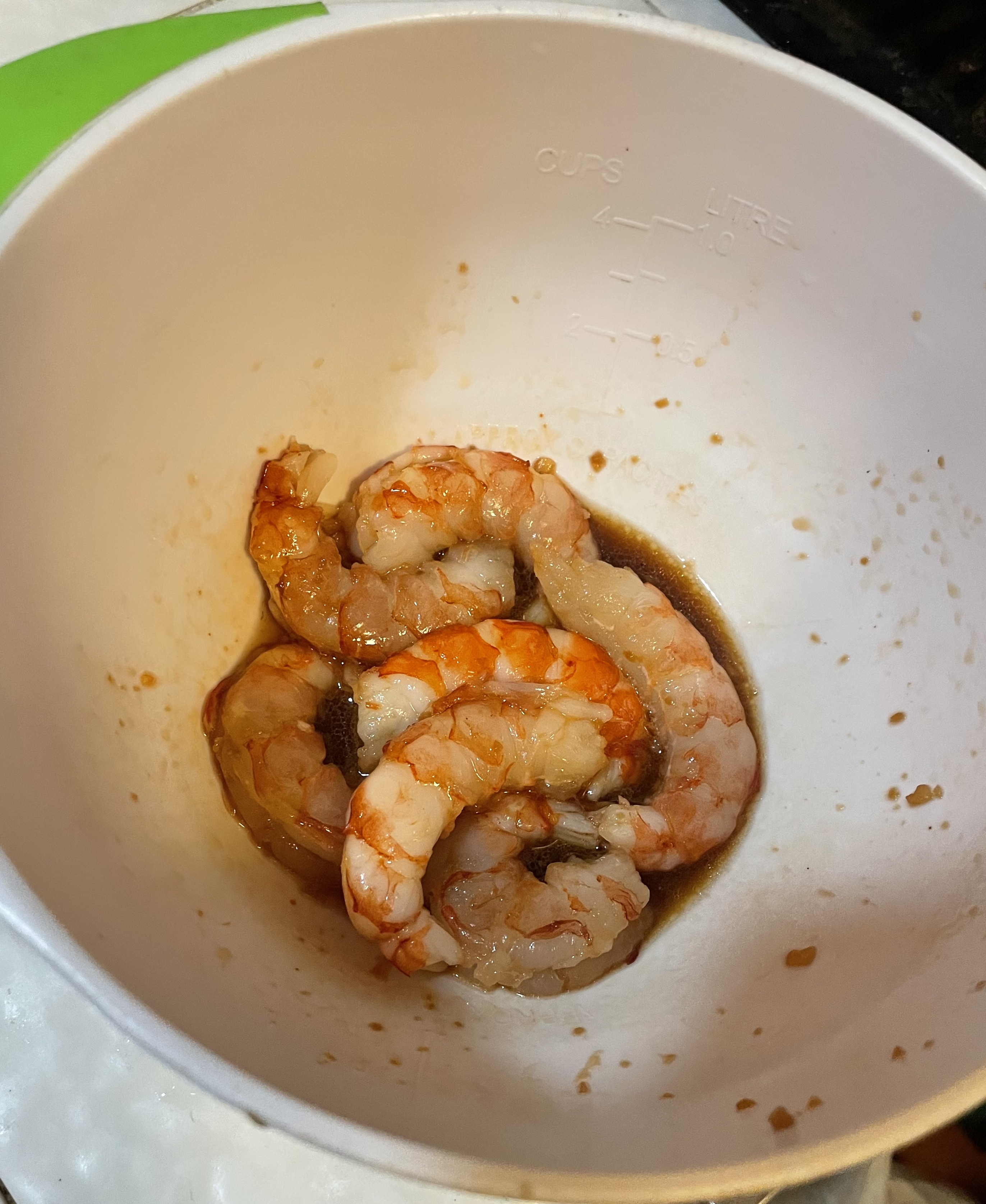 Marinate the Shrimp. Stir the marinade/sauce again and dose the shrimp with perhaps a third of it. Let it rest in the fridge for maybe 15 minutes.