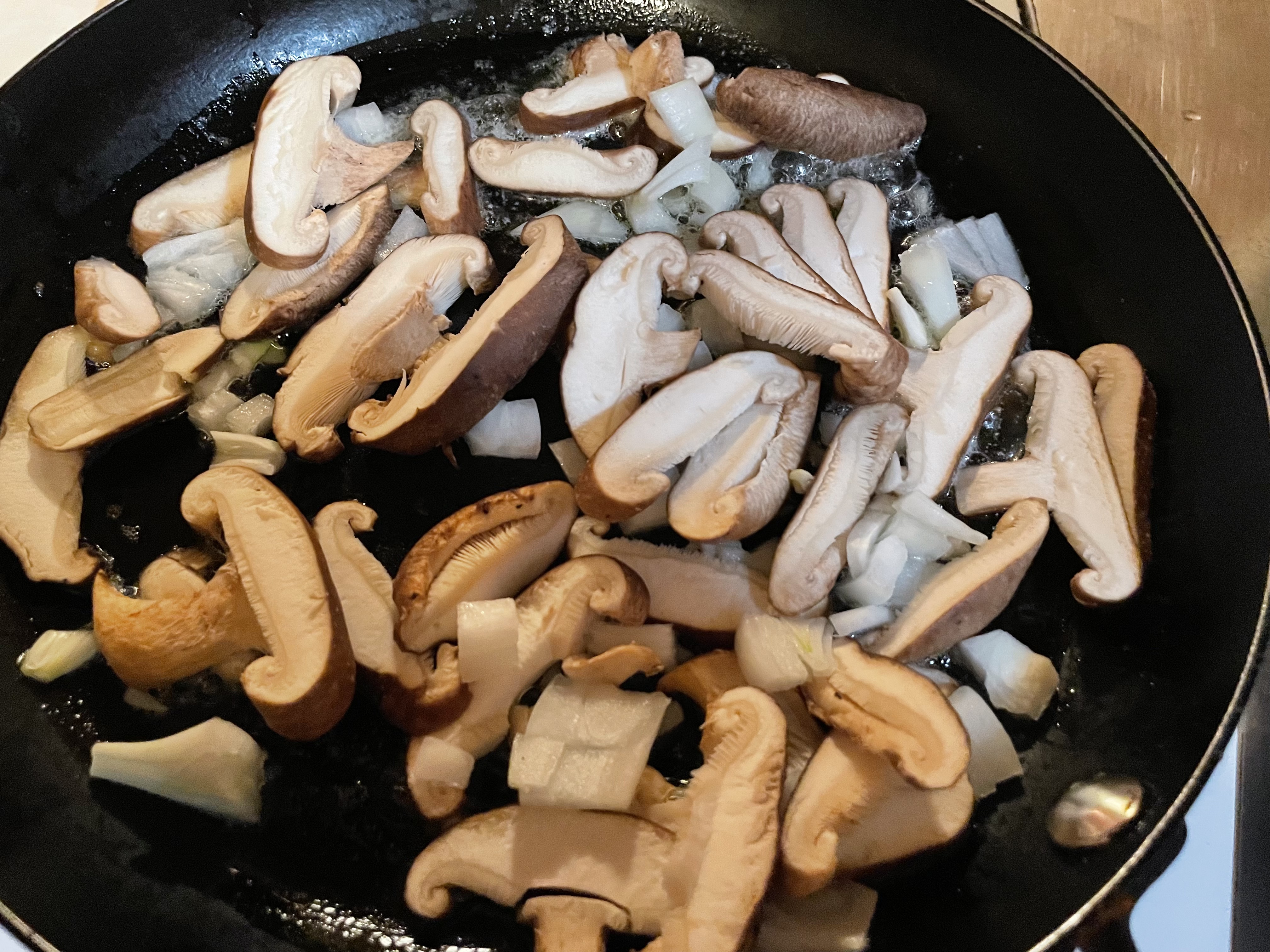 The Fixings. The mushrooms get a gentle damp paper-toweling and requisite slicing. The frozen shrimp get a minute in the microwave, enough to peal their shells and tails. (Had I been making a stew, I’d have saved these for enriching the broth.)
