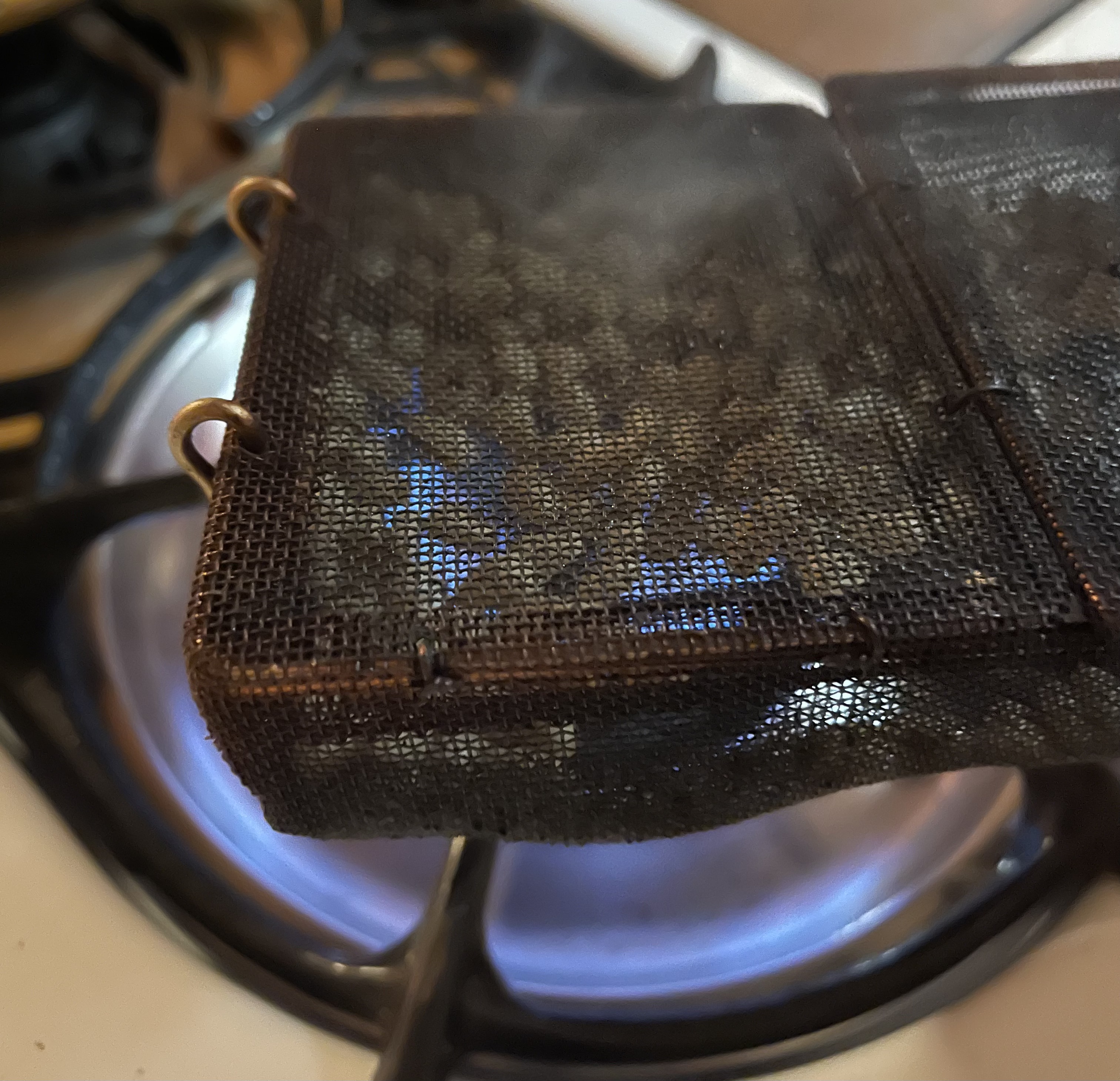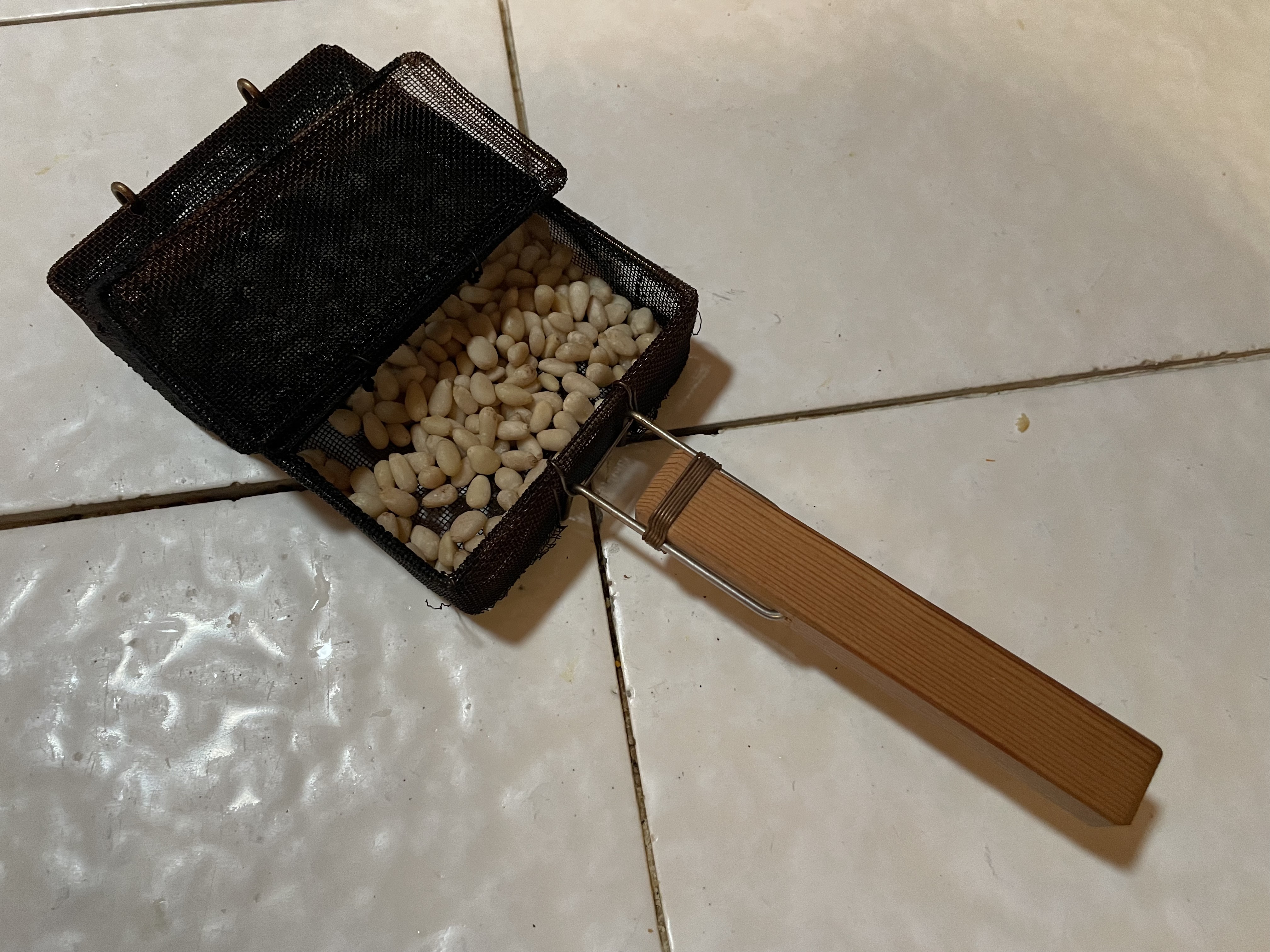 The gizmo is designed for toasting sesame seeds, but works fine with pine nuts as well. I confess this time around I should have toasted them darker.