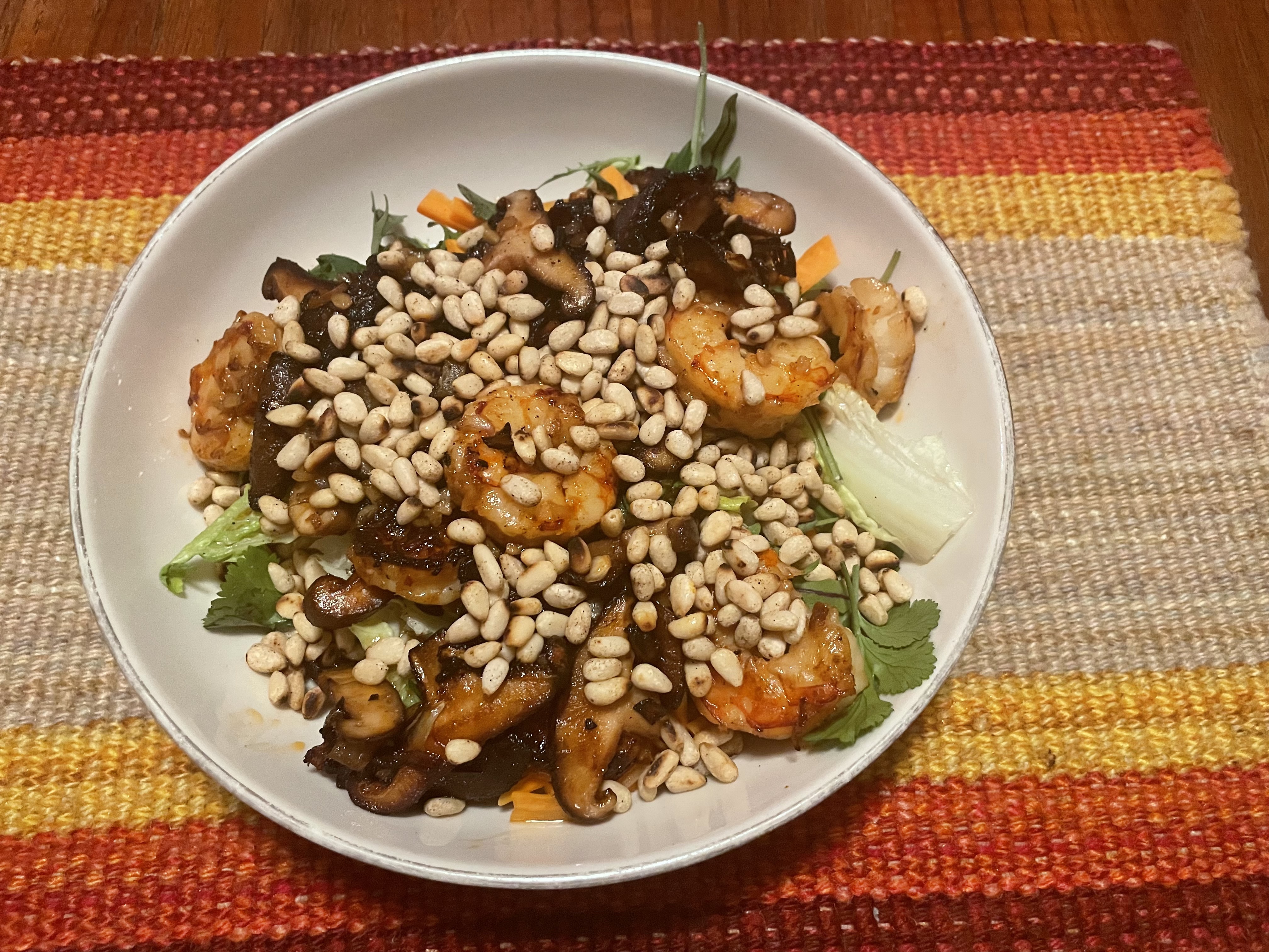 Then toss in the carrots and greens, and mix them around. There’s no happy snap of this because it’s when I thought of adding the pine nuts. Where’s my handy Japanese toaster?