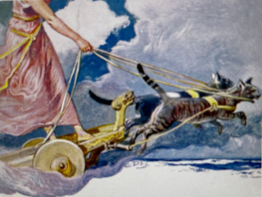 Other Godly Felines. History Quiz notes, “Ancient Norse writer Snorri Sturlusson described the goddess Freyja by writing, ‘When she travels, she drives two cats and sits in a chariot.’”