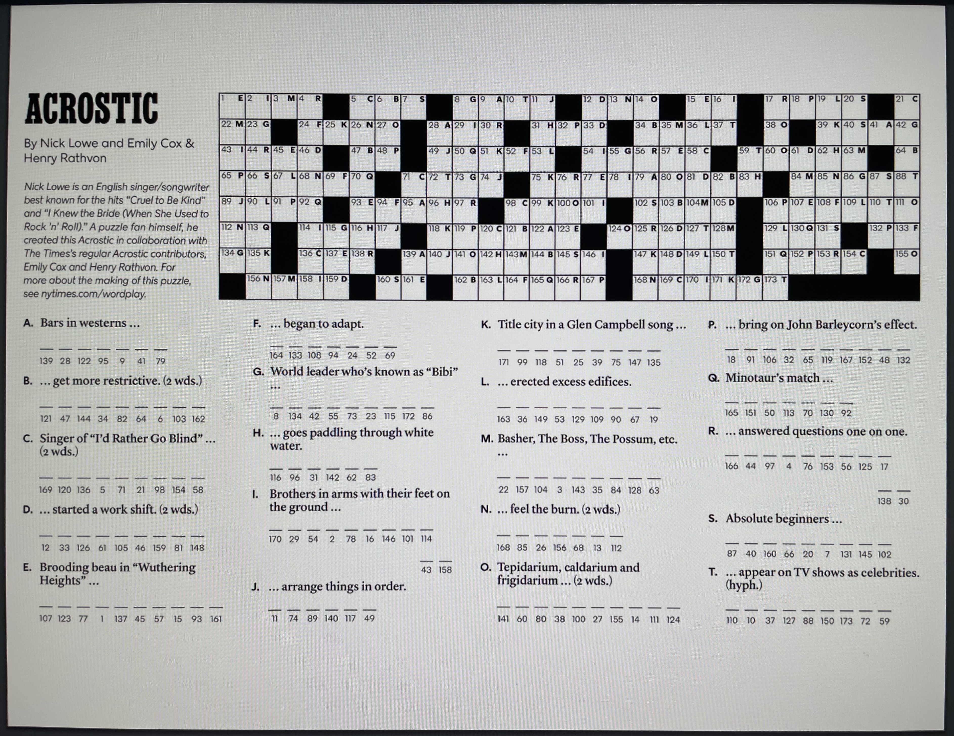 YESTERDAY’S JOYS OF RESEARCH concluded with citing my youthful weekly fix of Double-Crostic puzzles. Caitlin Lovinger describes this word game in “Variety: Acrostic,” The New York Times, July 17, 2020. Kindly enough, she even provides an example.