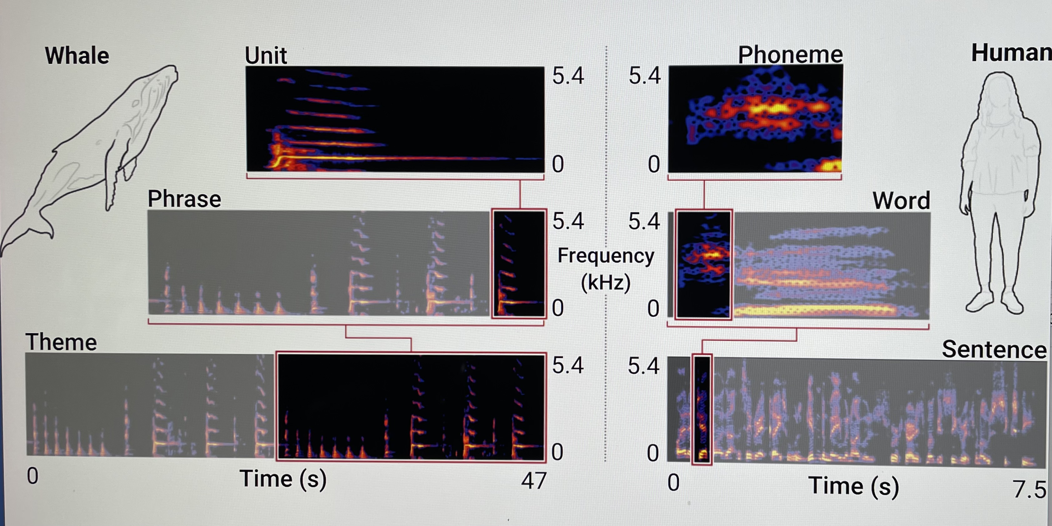 From Arnon et al.’s Abstract: “In this study, we applied methods based on infant speech segmentation to 8 years of humpback recordings, uncovering in whale song the same statistical structure that is a hallmark of human language.”