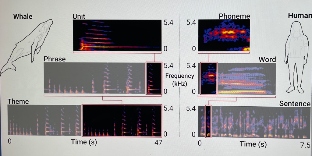 It isn’t that whale songs share semantic meaning with human language. Rather, as described by Emily Anthes in “Humpback Whales Sing the Way Humans Speak,” The New York Times, February 6, 2025, it’s that “both communication systems are culturally transmitted, learned from others in the community and passed down over generations.”