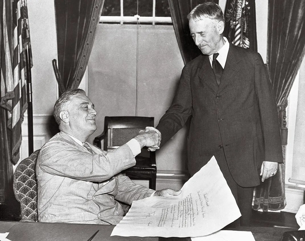 President Roosevelt greets Henry L. Stimson upon the Senate’s confirmation as Secretary of War, July 10, 1940.