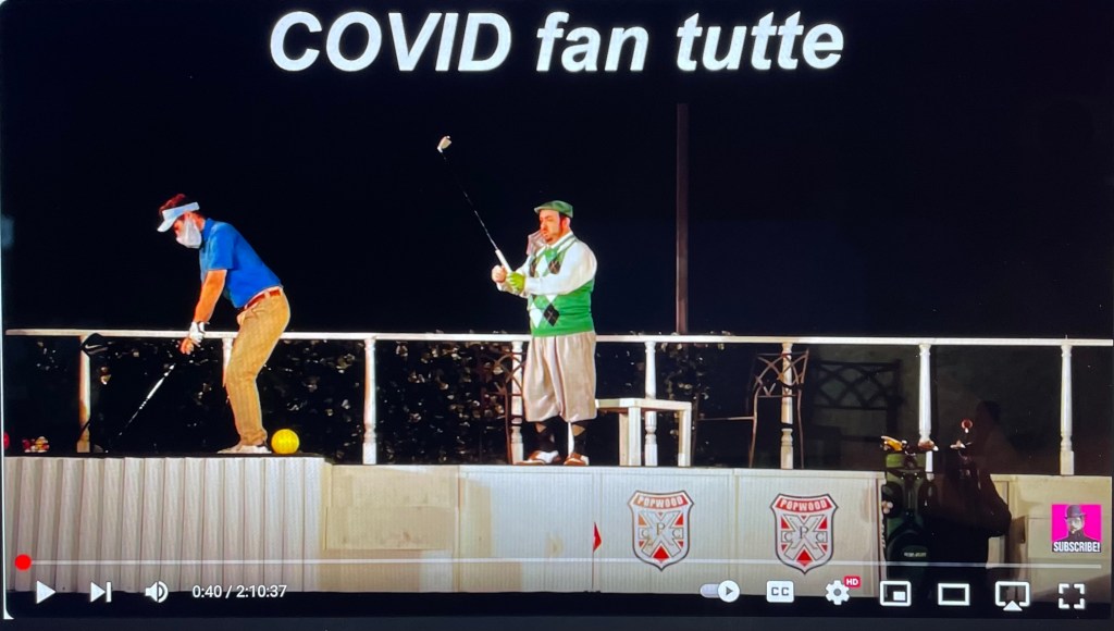 POP’s Drive-in COVID Così. During the height of Covid in November 2020, POP’s COVID Fan Tutte was presented as a Covid-confident in-your-car drive-in venue in the parking lot of Camarillo United Methodist Church. This Così’s imagined setting was Popwood Country Club golf resort with a “new English Libretto by [POP’s Founding Artistic Director and CEO] Josh Shaw with suggested (but mostly ignored) edits by [bass-baritone] E. Scott Levin based on the original libretto by Lorenzo Da Ponte.”