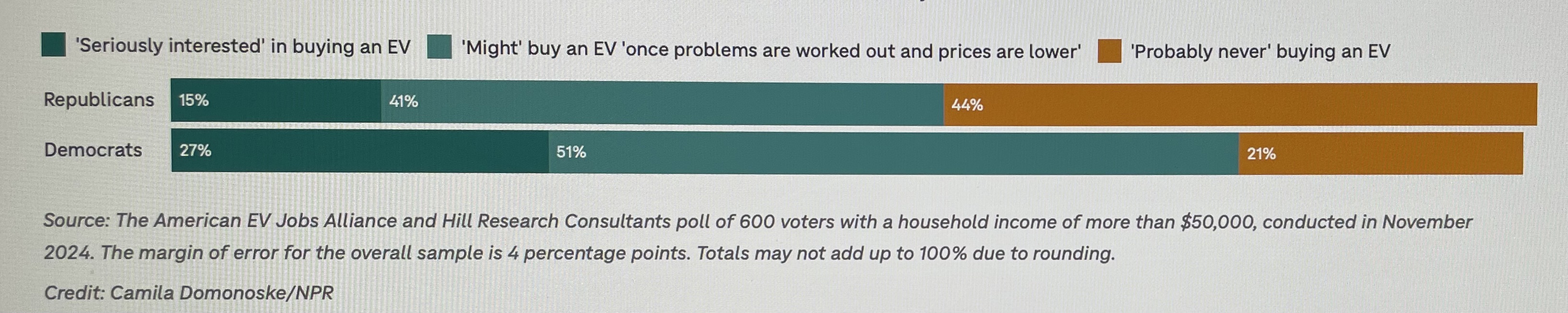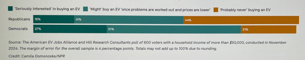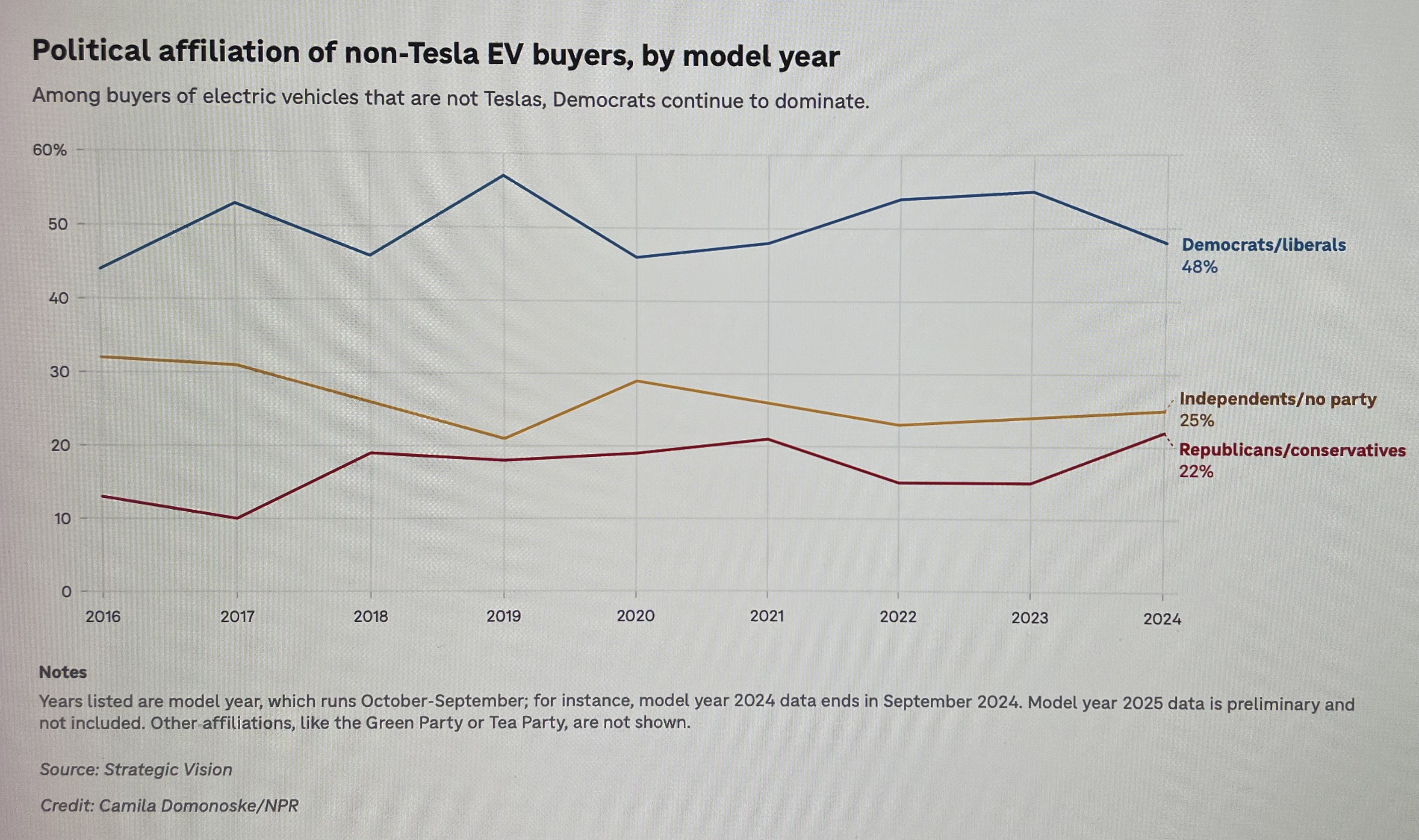 Above, Democrats/liberals like EVs, but (below) less Teslas.