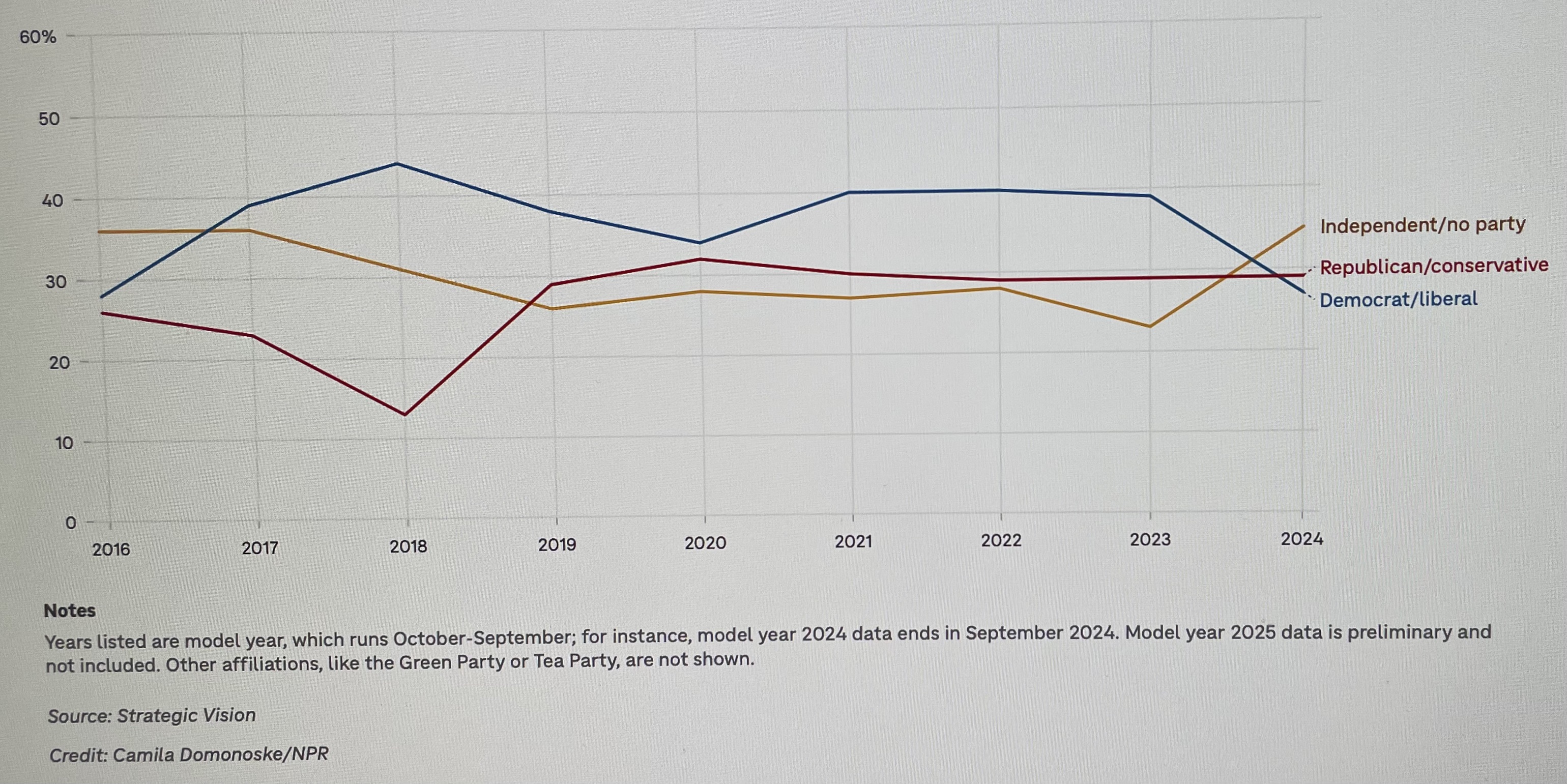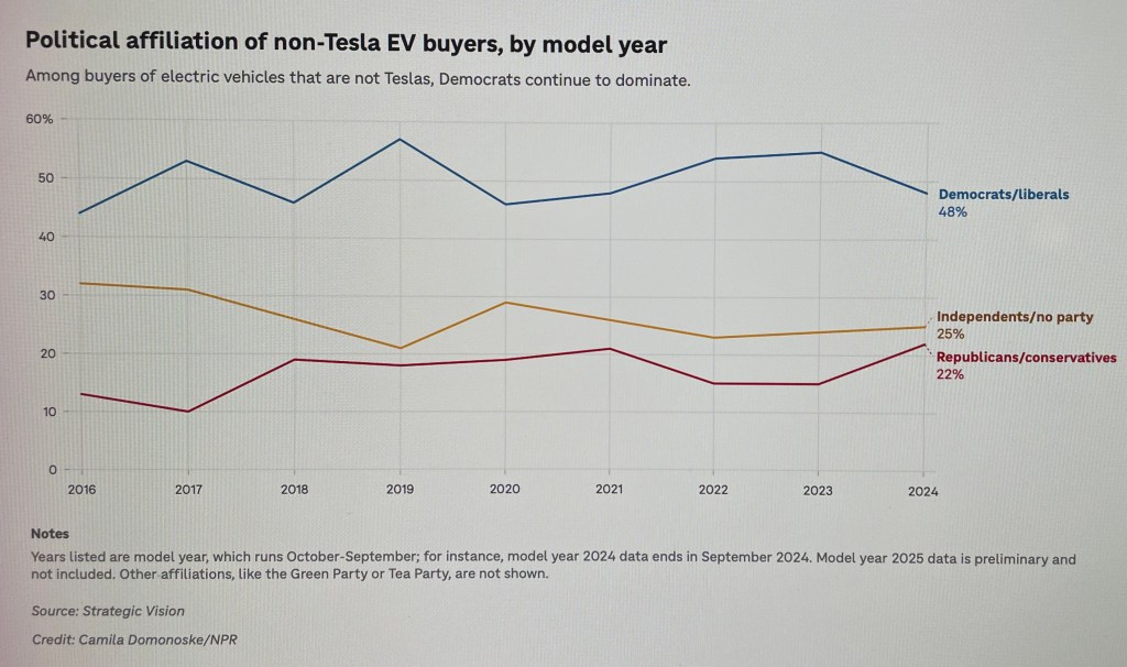 Note, Tesla ownership has been sorta split equitably among liberals, conservatives, and independents.