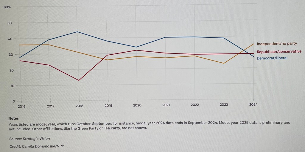 For a long time, Model Year 2017 through late 2023, Democrats/liberals had a slight edge in Tesla ownership.  No surprise, given Republicans/conservatives’ general apathy toward environmental issues and limited EV enthusiasm.