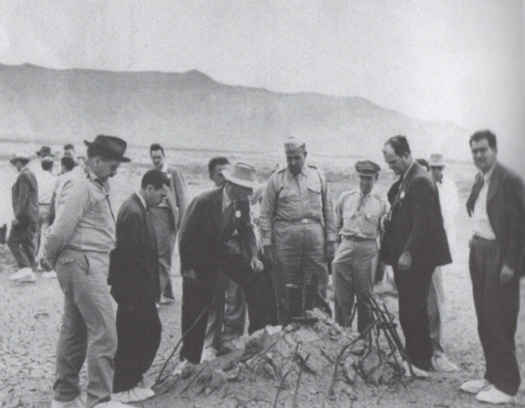 Oppenheimer (center left with broad brimmed hat) and General Groves (center right with military cap) inspect the site of the first detonation of an atomic bomb. Image from Opera: The Autobiography of the Western World.