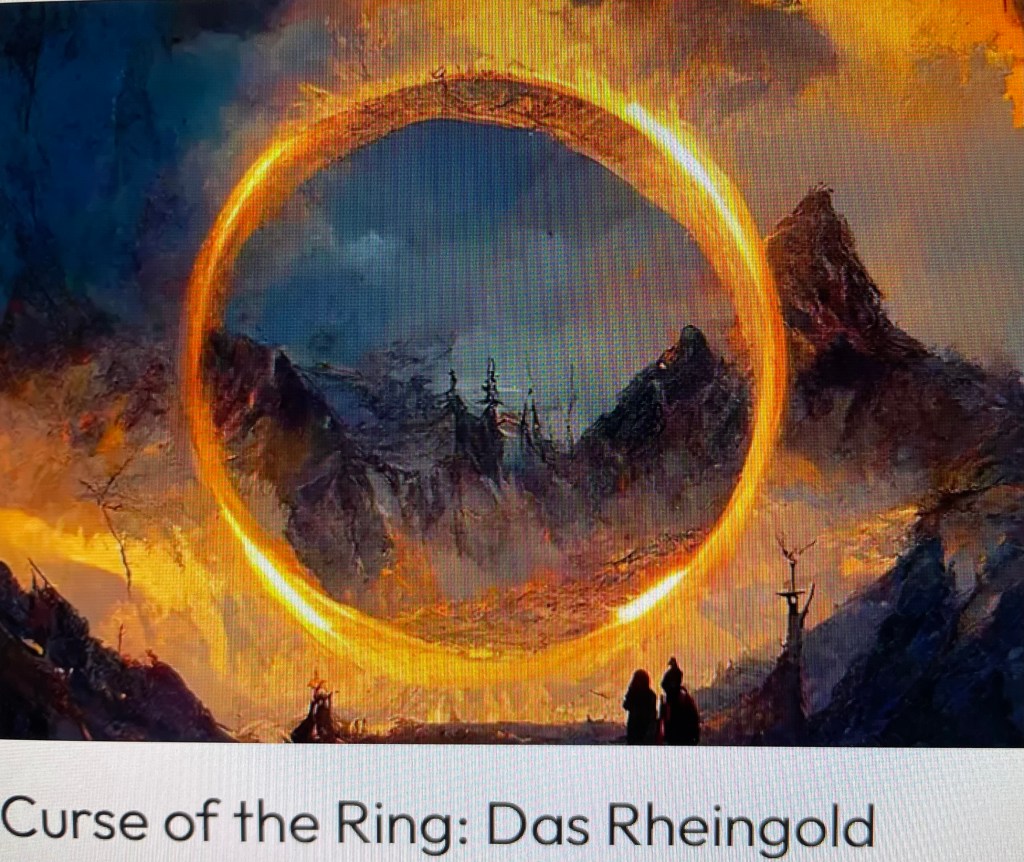 And Speaking of Das Rheingold…. Daughter Suz and I enjoyed a semi-staged version of this first of Wagner’s Ring Cycle conducted by Pacific Symphony’s Carl St.Clair at our nearby Renée and Henry Segerstrom Concert Hall. The term “semi-staged” places it midway between a concert version (singers performing in front of the orchestra) and a fully staged production (full scenery and costumed). Indeed, the performers in this one were appropriately Ring-attired and moved around scrims onto which projected images enhanced the action.