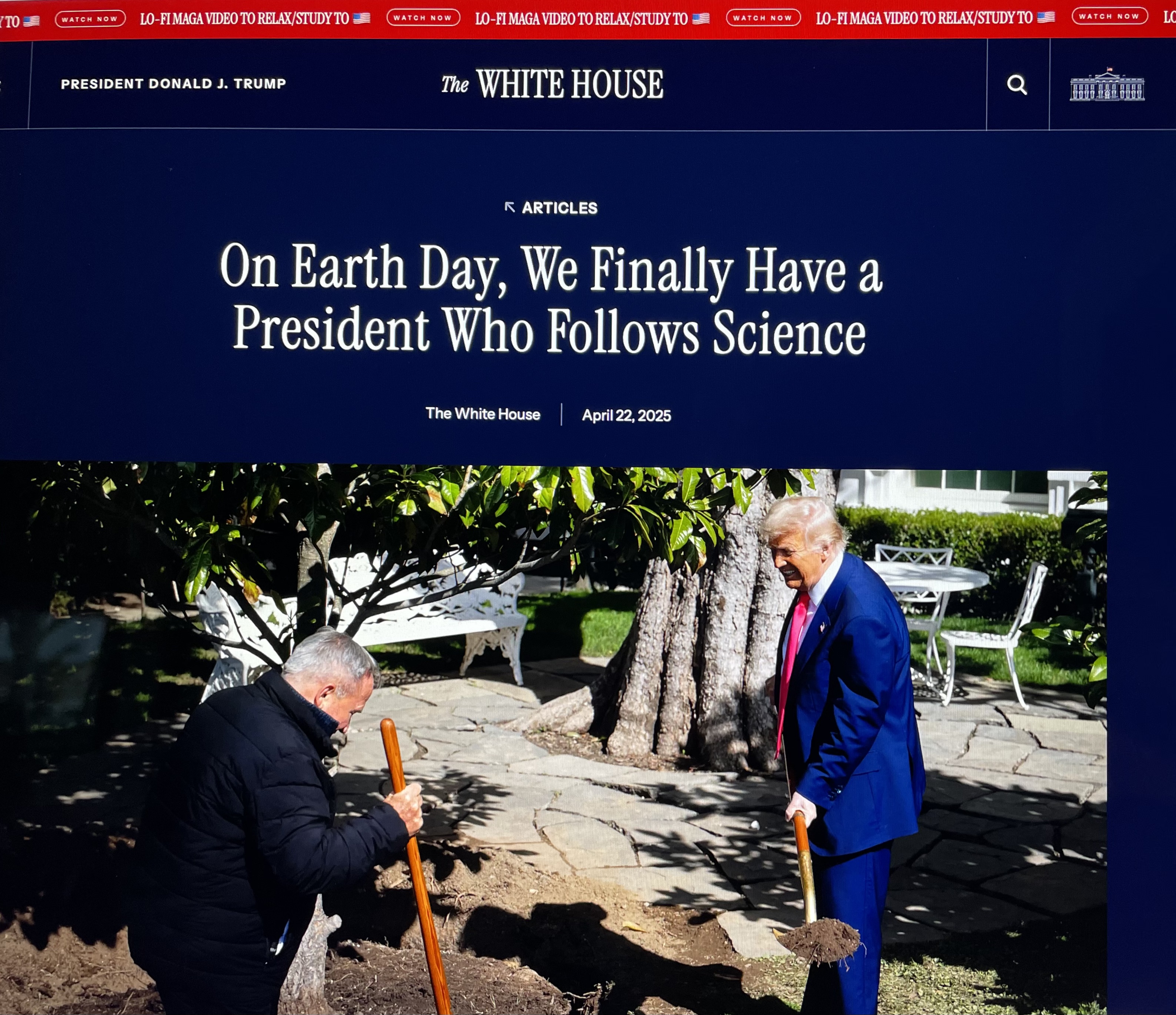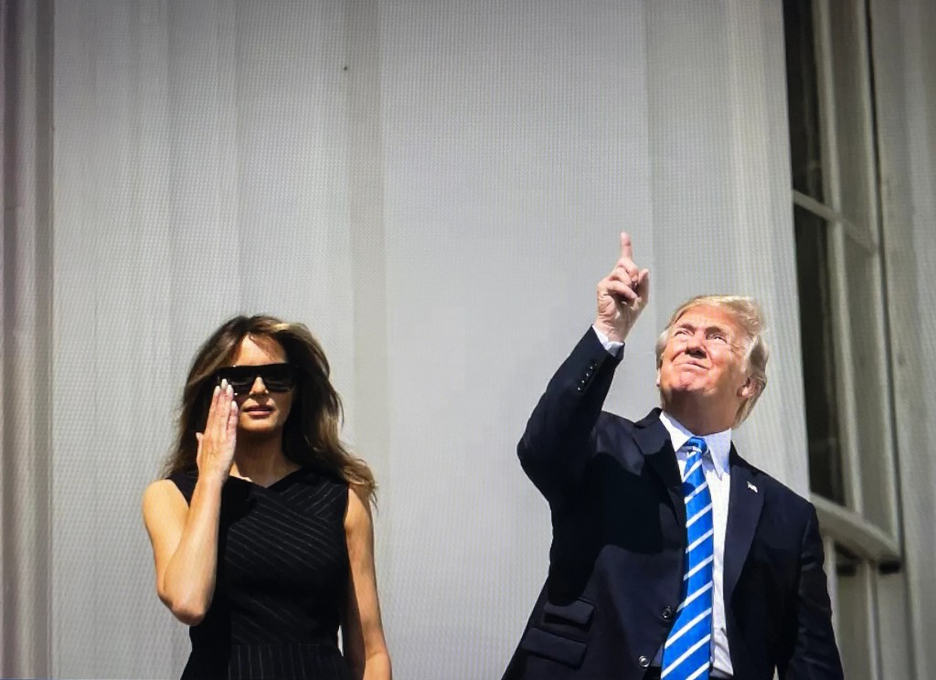 Above, the lead page for which we taxpayers paid. Image from The White House, April 22, 2025. Below, the president’s scientific prowess in admiring a solar eclipse. Image from the Chicago Tribune via “Trump and Science/Tech.”