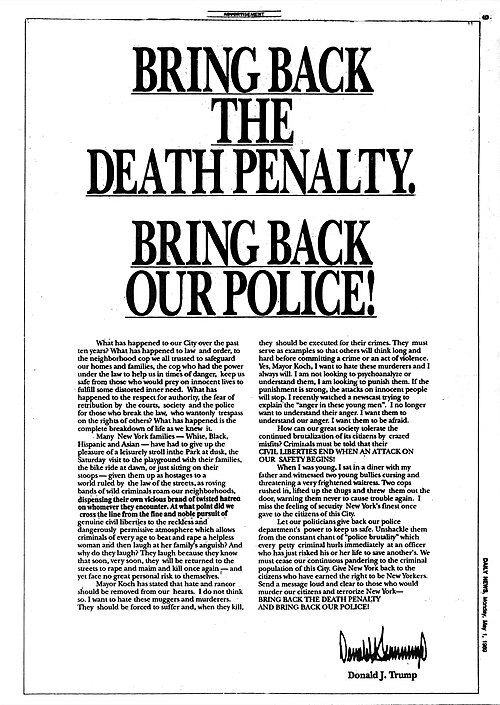 A full-page advertisement was taken out by Donald Trump in the May 1, 1989, issue of the Daily News. Image via Wikipedia.
