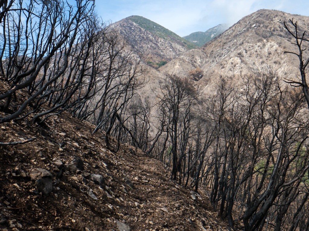 Poodle-dog bush can thrive relatively quickly in an area recently burned, like this spot scorched by the Eaton Fire in the San Gabriel Mountains. Image by Matt Baffert via LAist.