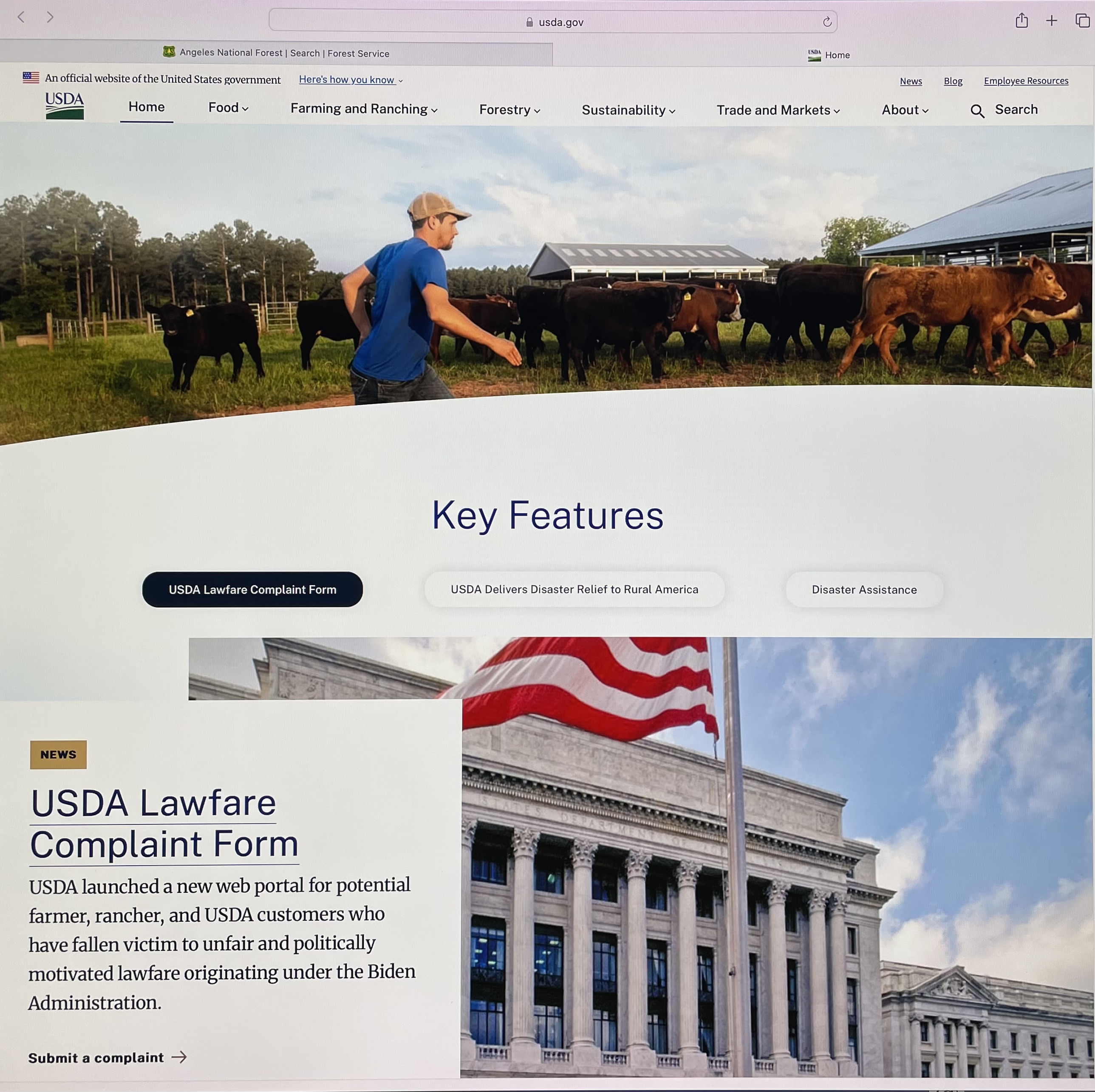WHAT TRUMP BULLSHIT IS THIS?!! In particular, note, “USDA launched a new web portal for potential farmer, rancher, and USDA customers who have fallen victim to unfair and politically motivated lawfare originating under the Biden Administration. Submit a complaint➝”
