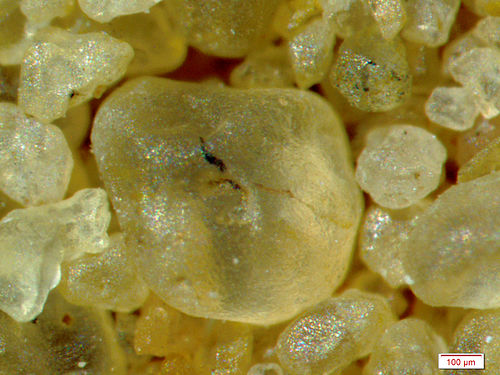 Above, grains of sand shown by scanning electron micrograph. Image by NASA via Wikipedia. Below, sand grains from Egypt’s Western Desert; pitting is a consequence of wind transportation. Image by Wilson44691 also via Wikipedia.