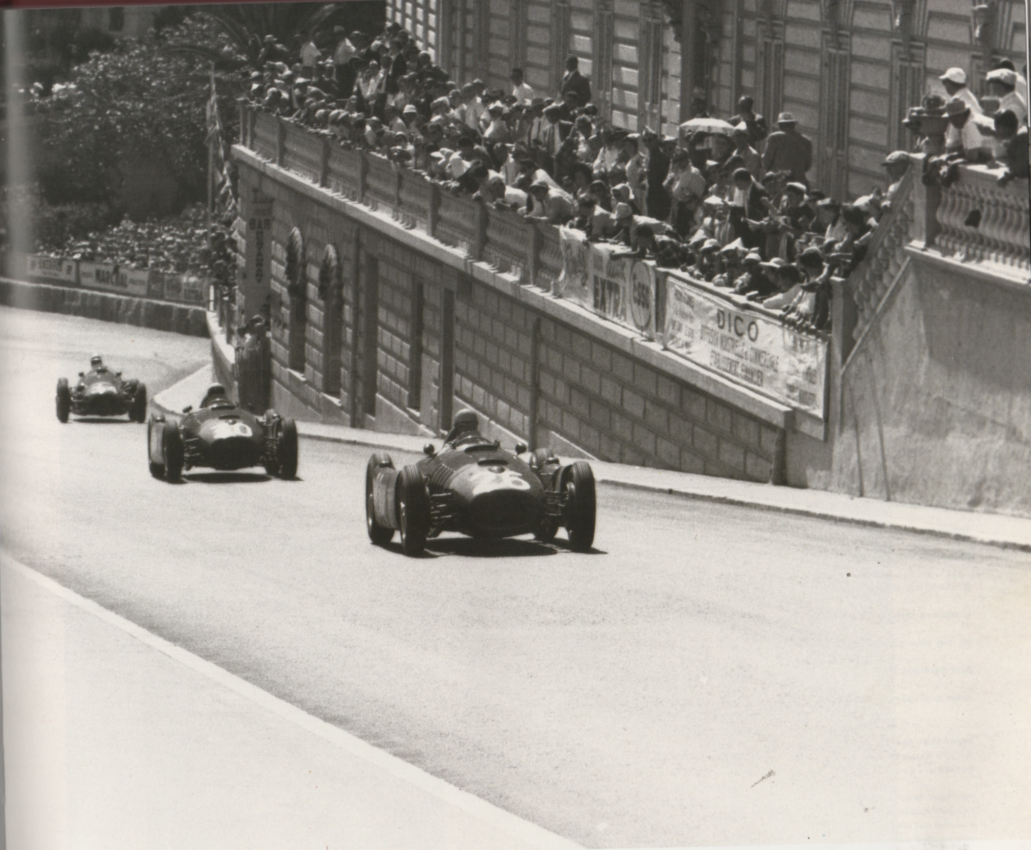 Monaco 1955. Ascari and his Lancia D50 leads his teammate Castellotti up the hill towards Casino.