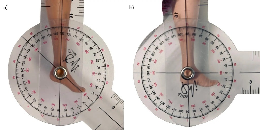 A tool for measurement of Barbie’s foot alignment over the years. Images by Dr. Cylie Williams.