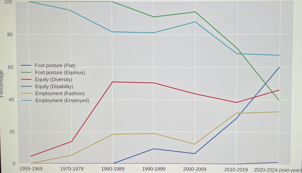 AT THE RISK OF UTTERING THE TRUMP-DREADED WORD “DIVERSITY,” here’s an academic report on “Flat out Fabulous: How Barbie’s Foot Posture and Occupations Have Changed Over the Decades, and the Lessons We Can Learn,” Williams et al., PLOS One, May 14, 2025.