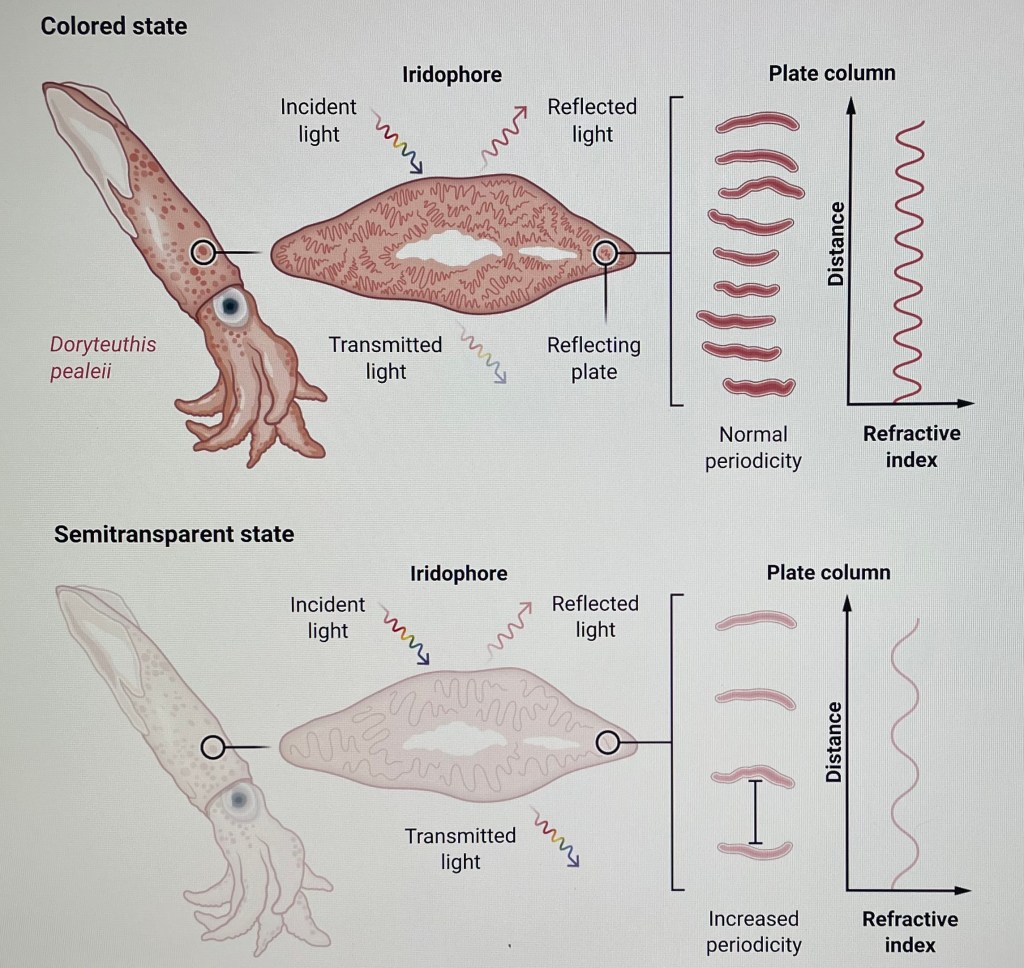 A Cephalopod Speciality. Shawkey observes, “Many cephalopods, including some squids and octopuses, can appear nearly transparent. They contain a specific protein called reflectin that enables dynamic changes of color and reflectance for disguise. However, how squids achieve the shift from colored to noncolored (transparent) states has been puzzling.”